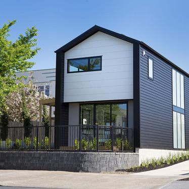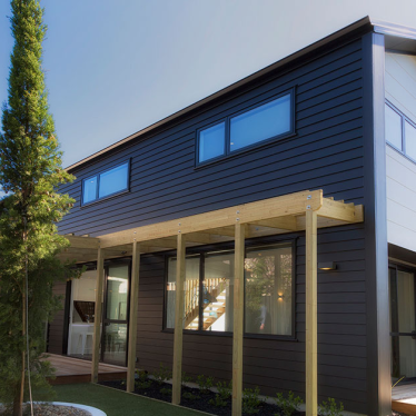 The gable roof has been completed with a combination of claddings, which vary to the gable ends with horizontal Stria weatherboards and vertical Axon panels, defining the overhang from the first floor. The main external walls forming a dominant outer layer with dark weatherboards and add scale.