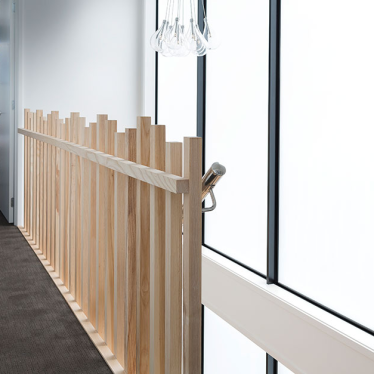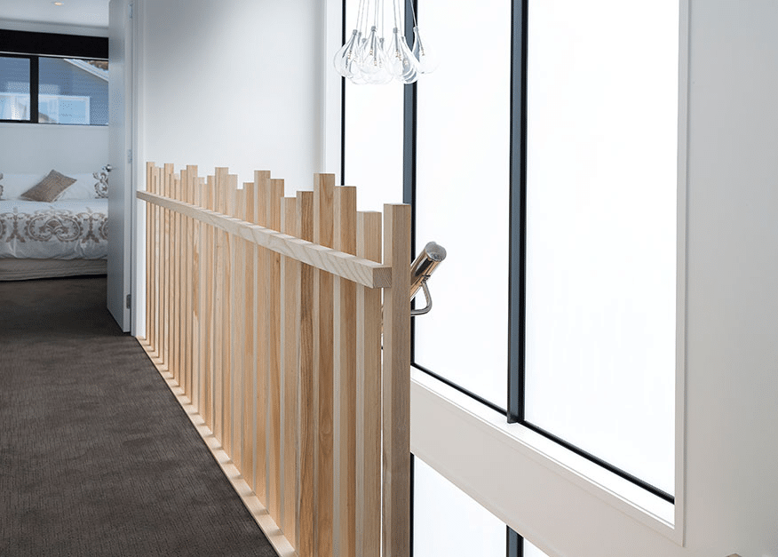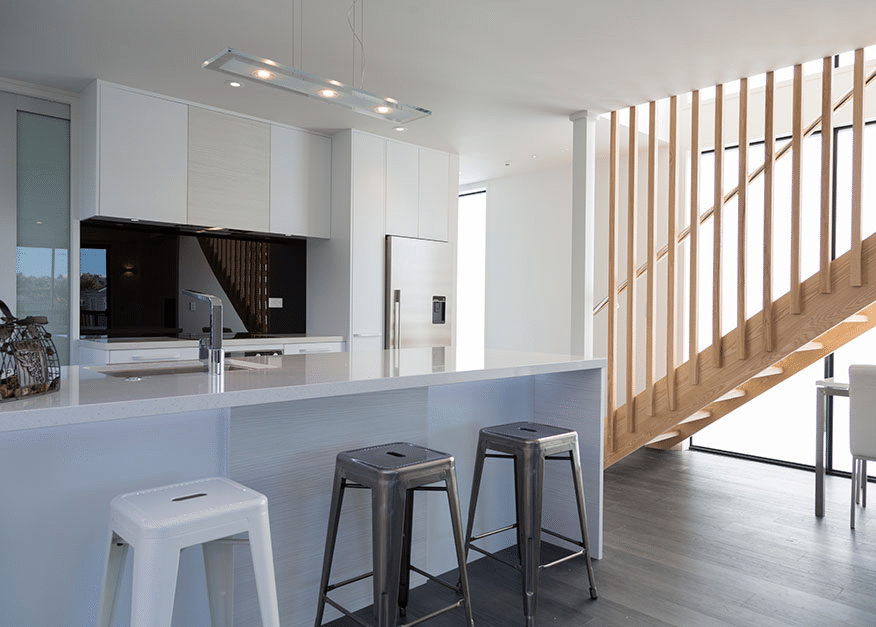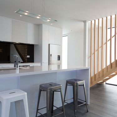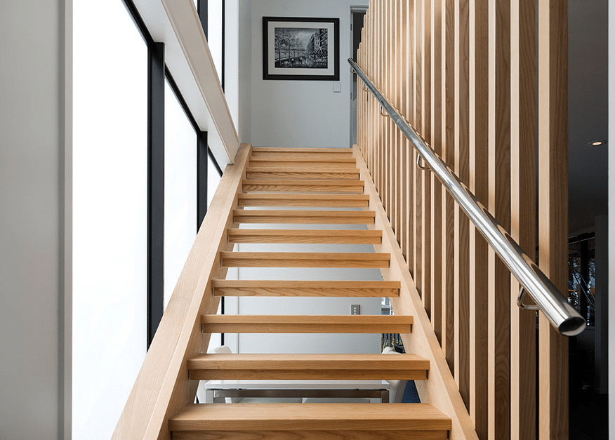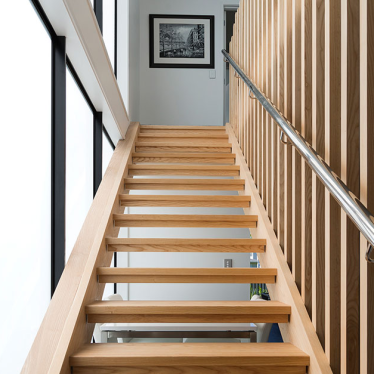 Upon entry to the home you are met with openness and light, with the open stairs providing a back drop against a full height glazed wall.