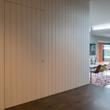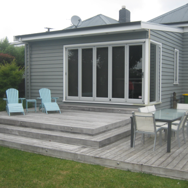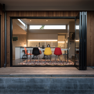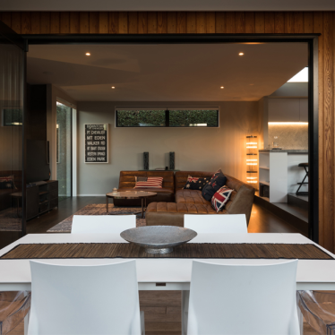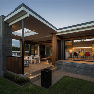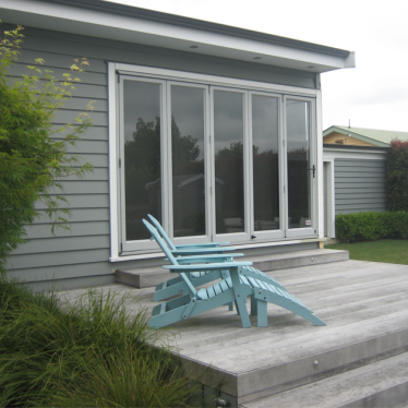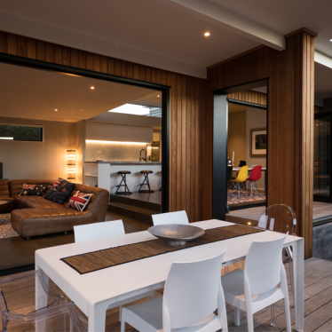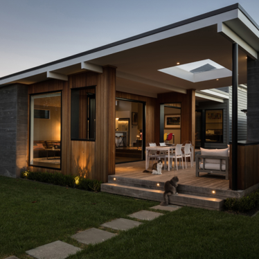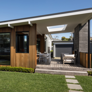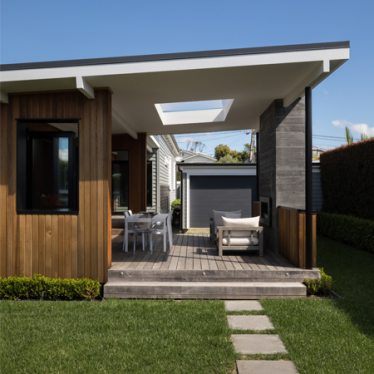 To that end, materials were chosen for their contrast with the original bevel back weatherboards. Stained vertical cedar cladding sits against exposed shuttered concrete chimneys, steel posts, and black aluminium joinery. Internally, aspects of the villa are continued through and evolved, with high ceilings adjoining a pop-up roof over the kitchen, and a gently raking ceiling over the living space.