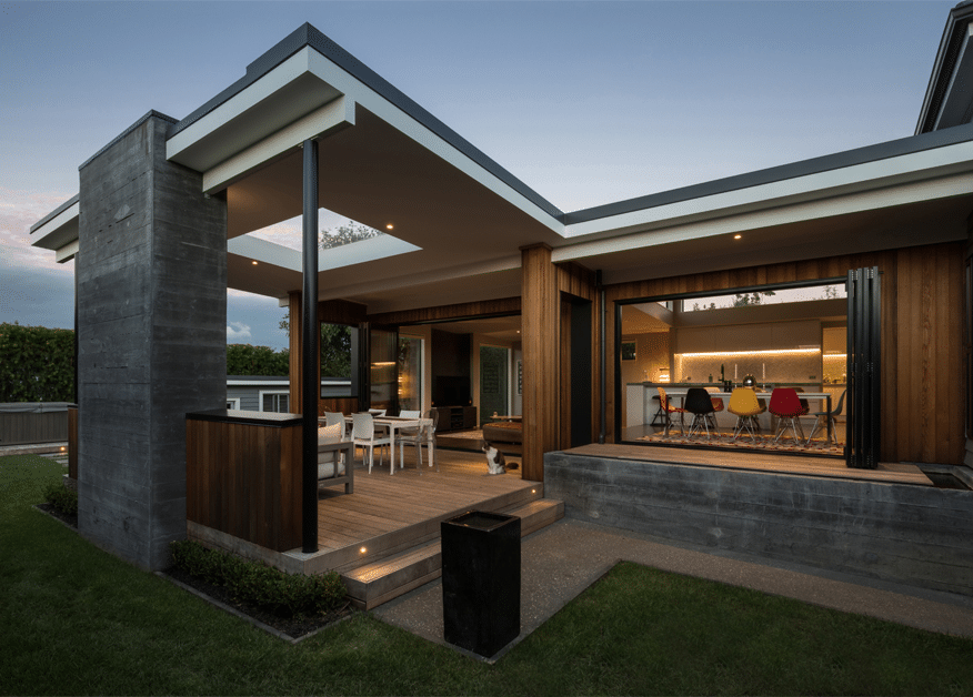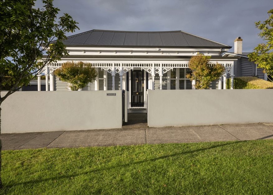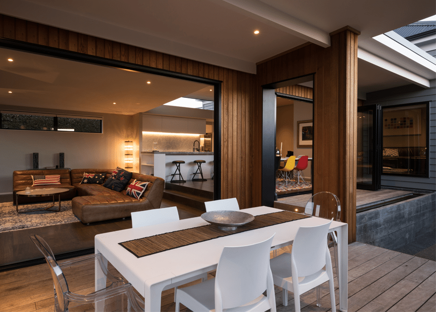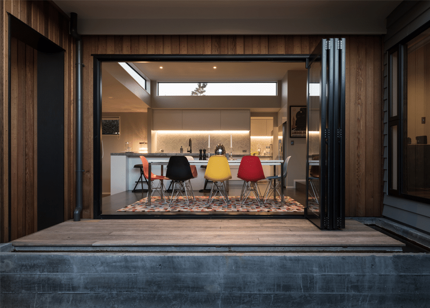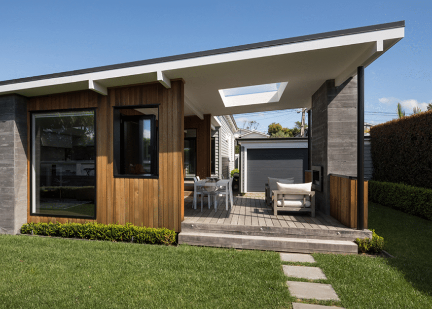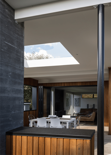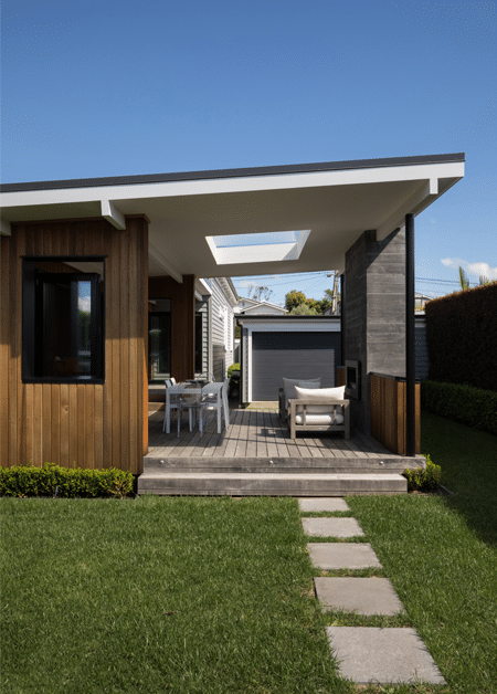 To that end, materials were chosen for their contrast with the original bevel back weatherboards. Stained vertical cedar cladding sits against exposed shuttered concrete chimneys, steel posts, and black aluminium joinery. Internally, aspects of the villa are continued through and evolved, with high ceilings adjoining a pop-up roof over the kitchen, and a gently raking ceiling over the living space.