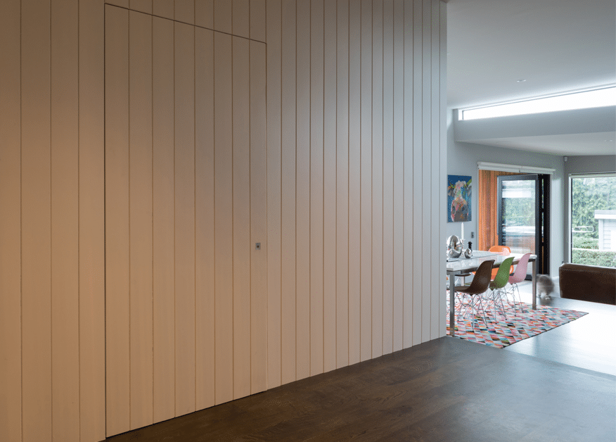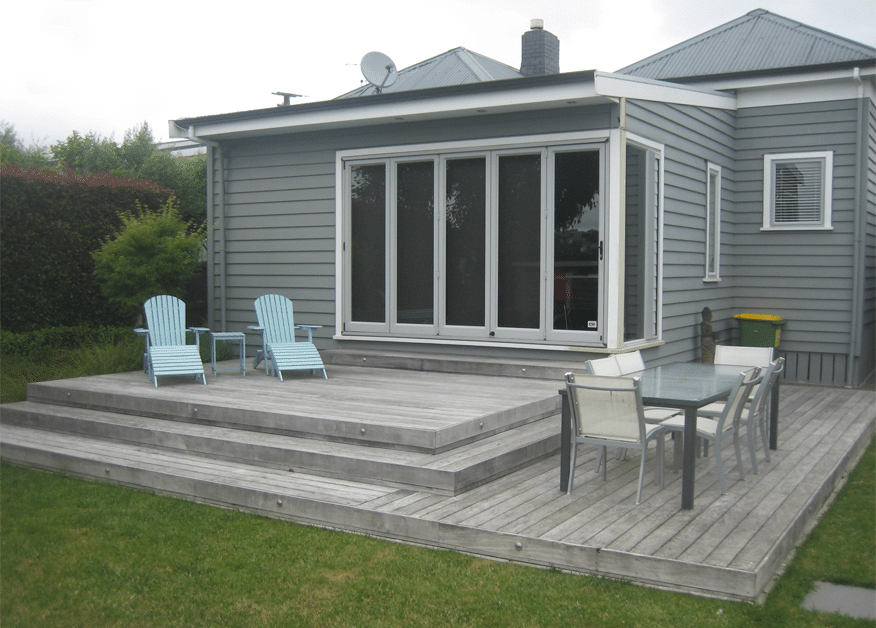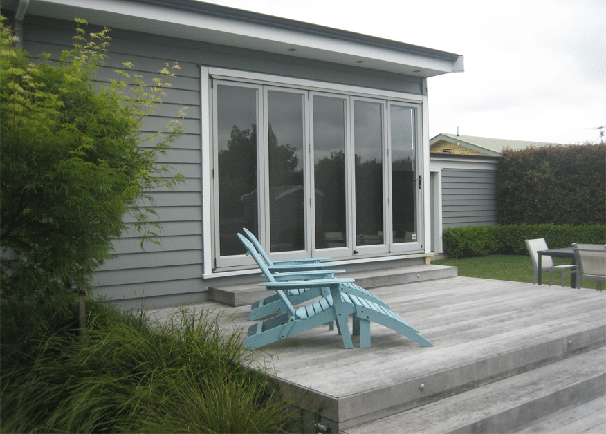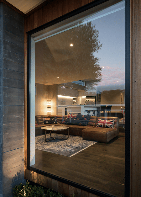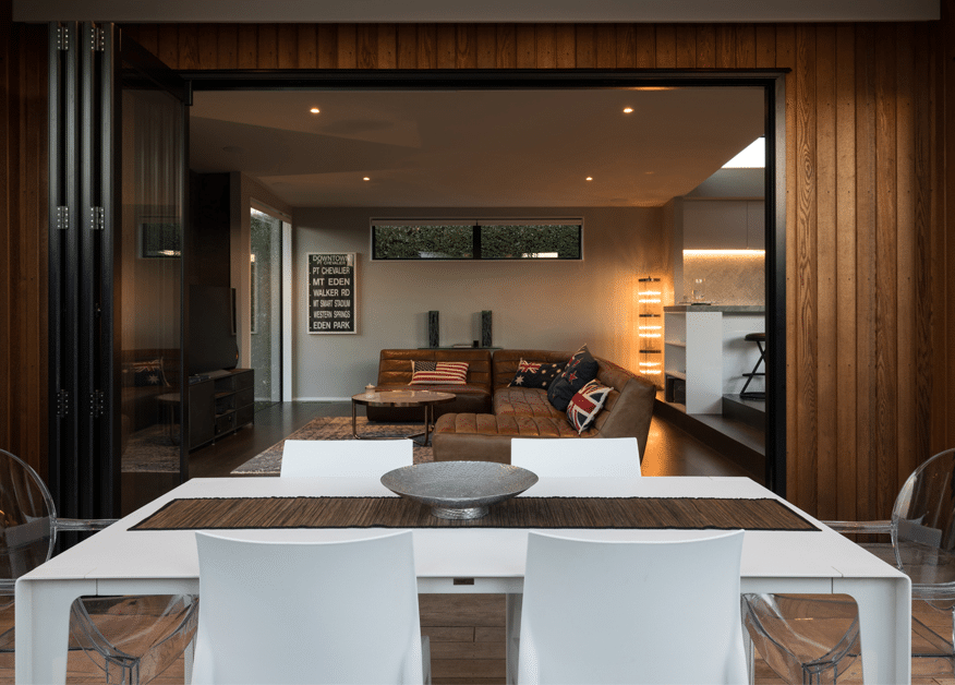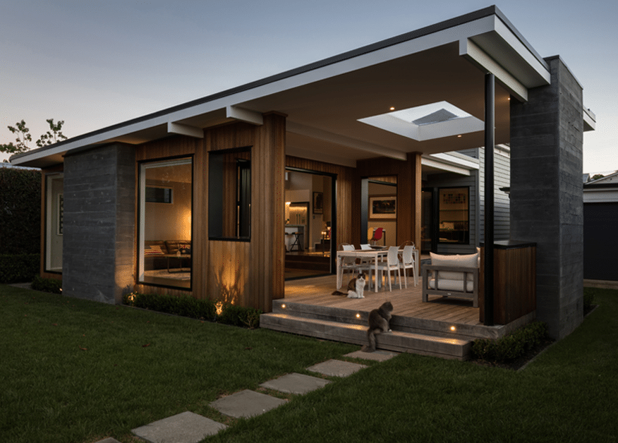 To that end, materials were chosen for their contrast with the original bevel back weatherboards. Stained vertical cedar cladding sits against exposed shuttered concrete chimneys, steel posts, and black aluminium joinery. Internally, aspects of the villa are continued through and evolved, with high ceilings adjoining a pop-up roof over the kitchen, and a gently raking ceiling over the living space.
