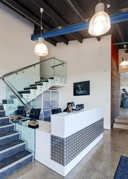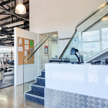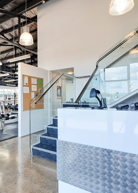 A feeling of openness in the gym area is created using mirrors, suspended glass screens to separate gym from reception and glass handrails to the stairway in reception.