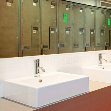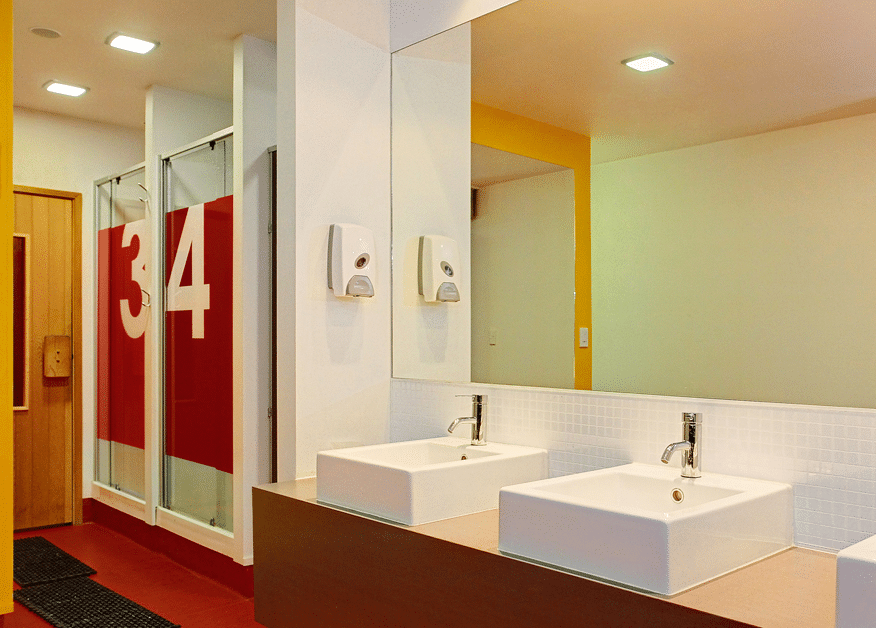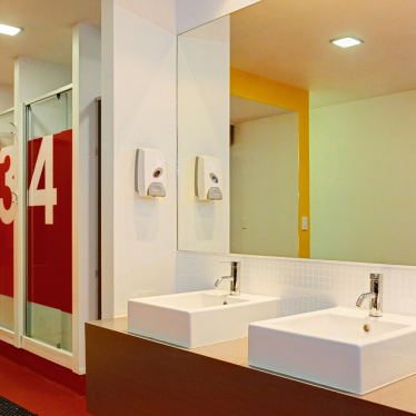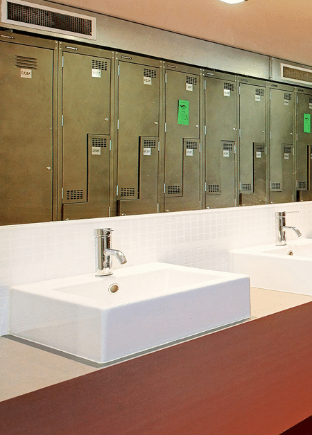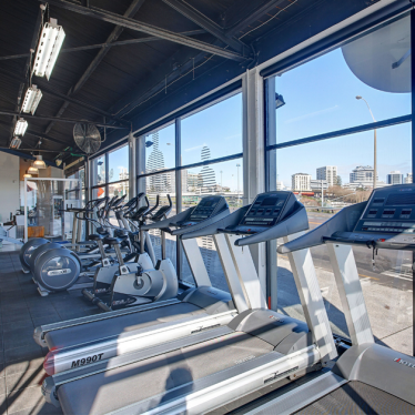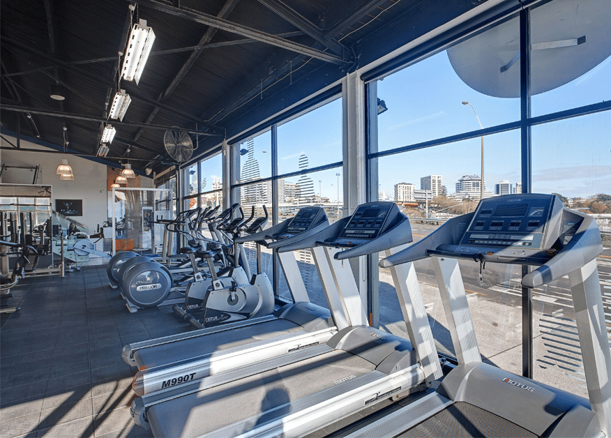 The existing concrete floor is polished and sealed to expose the aggregate and provide a hardwearing surface for circulation. Rubber flooring is used where required under gym equipment.