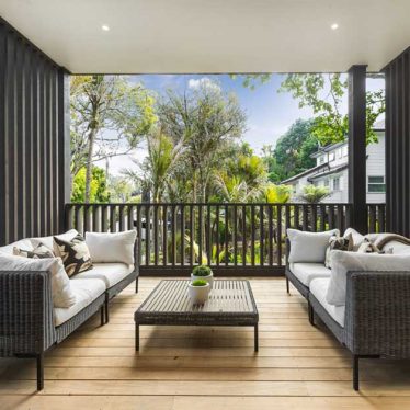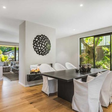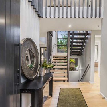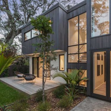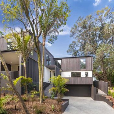 Two homes in Campbell’s Bay have been built in front of a natural creek, framed by native bush. Exterior materials were carefully selected to allow the homes to settle gently into the tranquil native bush surroundings, while the use of timber features across the interior spaces speak to the outside environment. The home is one of two built either side of the creek.