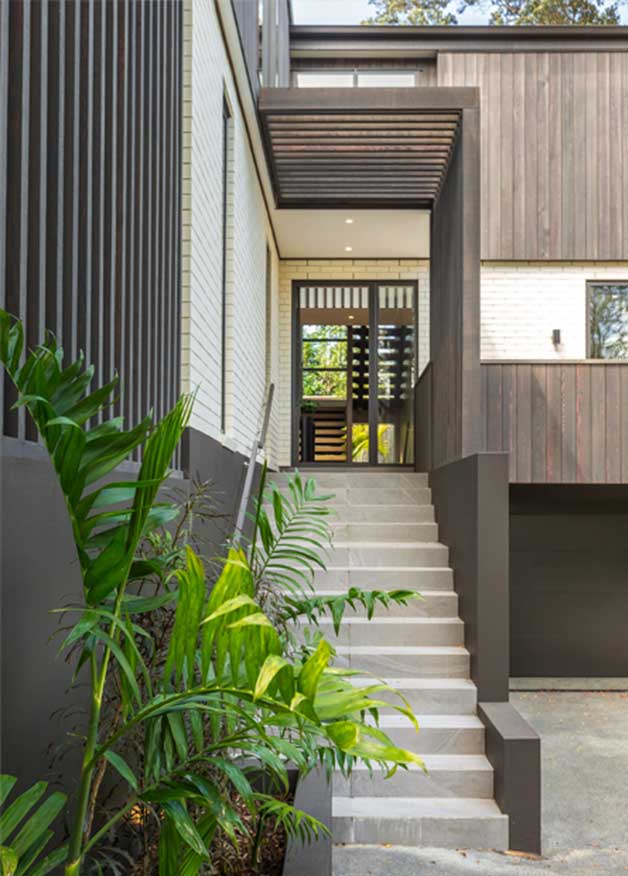 This home is designed in an ‘L’ shaped floor plan, providing maximum outlook and outdoor living space to the surrounding bush, and giving the first floor interior the sensation of being inside the tree canopy itself. Privacy between this home and its neighbour to the street side is achieved through the placement of the main living spaces in relation to the densest area of riparian flora to the edges of the central stream. The property boundary seems to vanish into the bush.