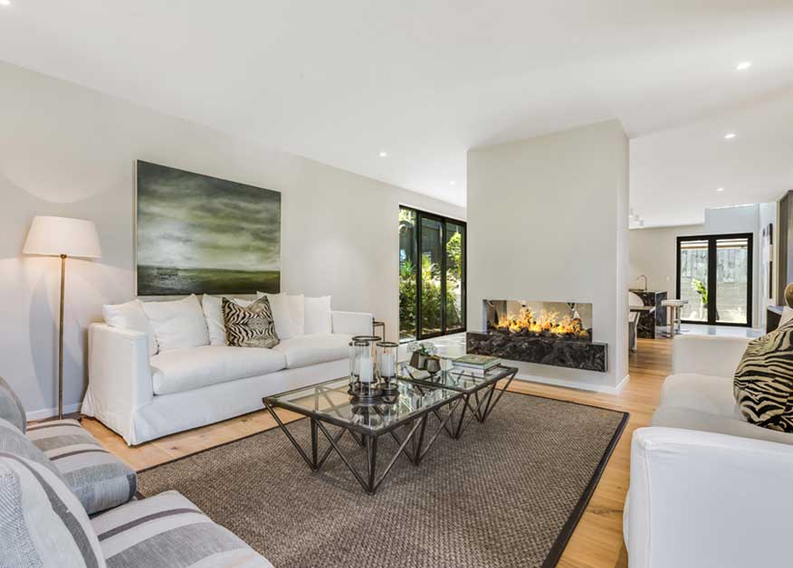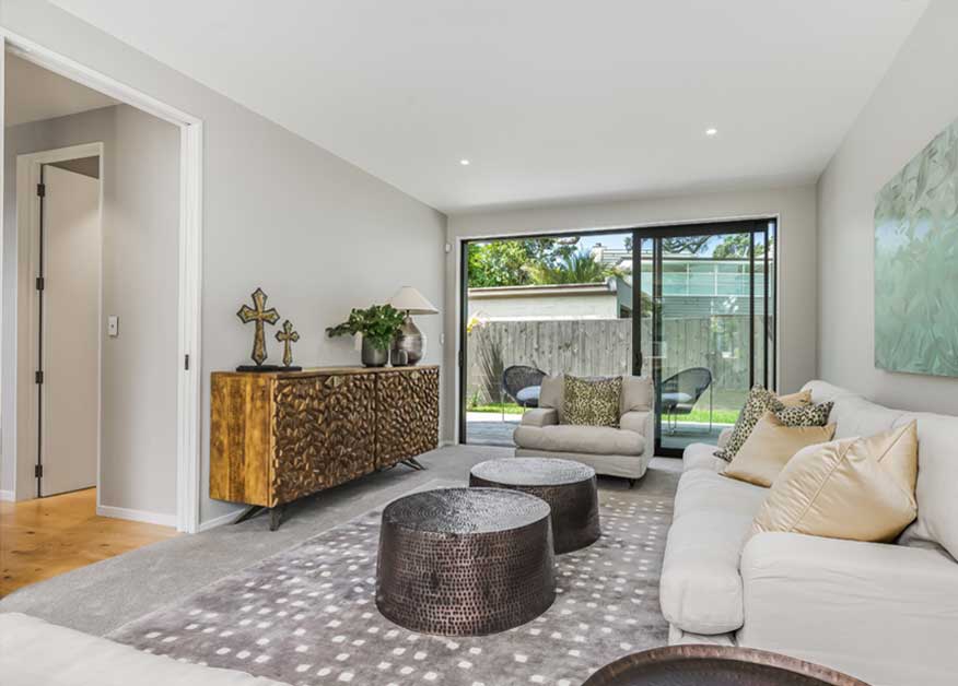 Two homes in Campbell’s Bay have been built in front of a natural creek, framed by native bush. Exterior materials were carefully selected to allow the homes to settle gently into the tranquil native bush surroundings, while the use of timber features across the interior spaces speak to the outside environment. The home is one of two built either side of the creek.