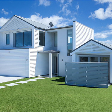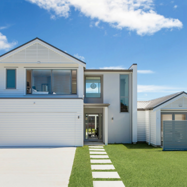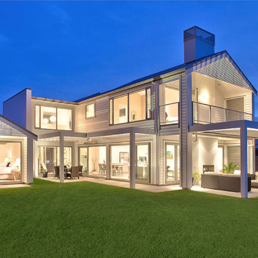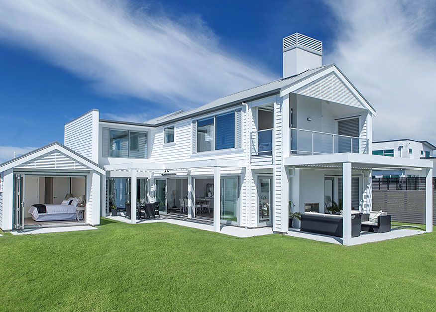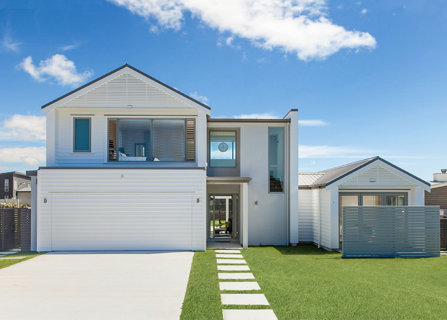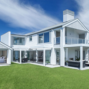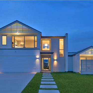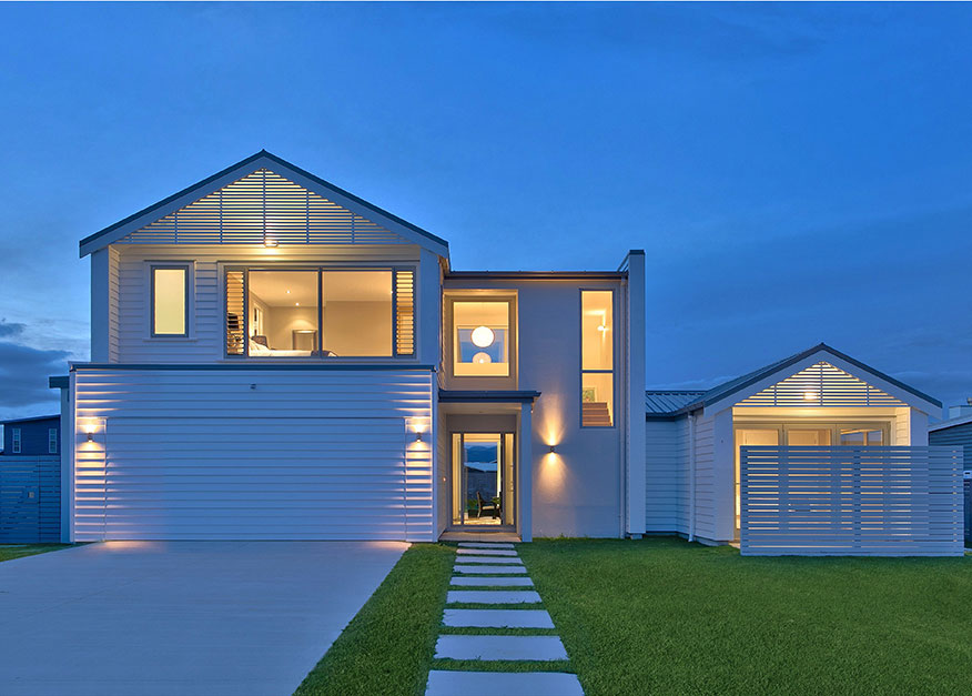 A boat house aesthetic was achieved using strong gable forms with metal roofing, timber battens and traditional timber weatherboard cladding.