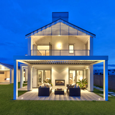 Outdoor living areas are designed to be versatile. One has a closing aluminium louvre roof extending from the end of the open plan living/dining kitchen area and includes a double sided fireplace. The other outdoor area, with timber louvres, is located off the dining room and is a more sheltered space nestled between the wings of the house.