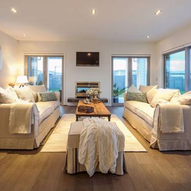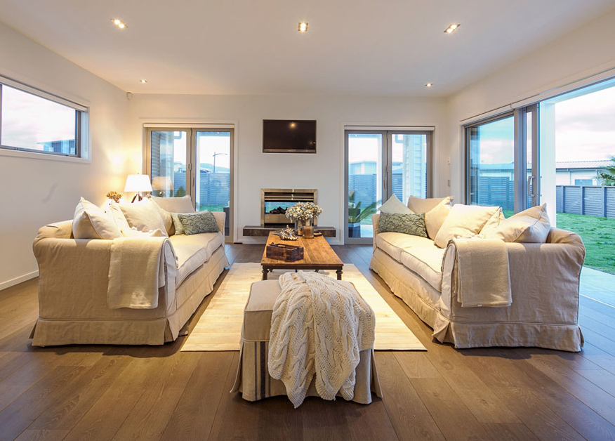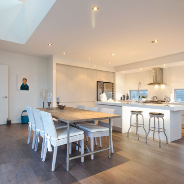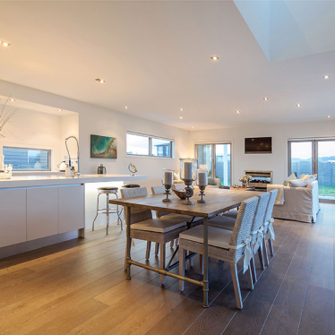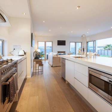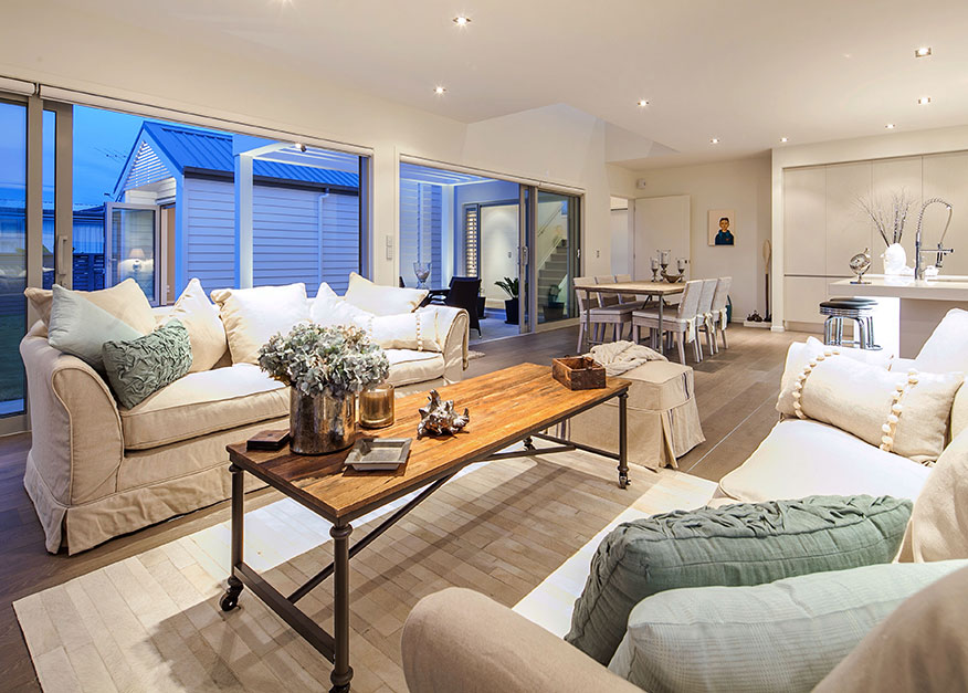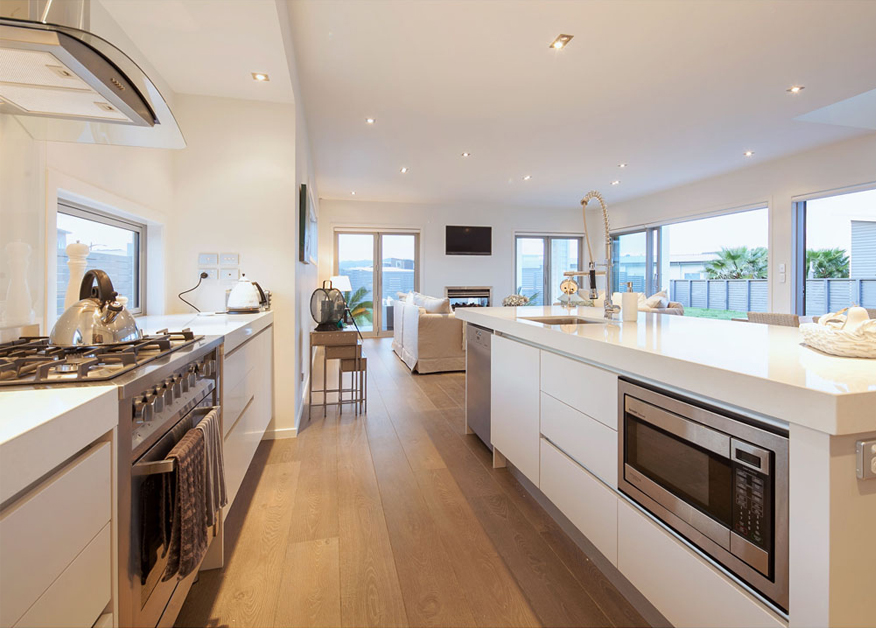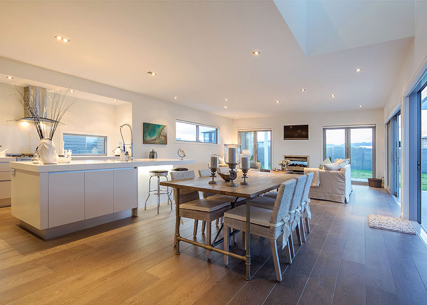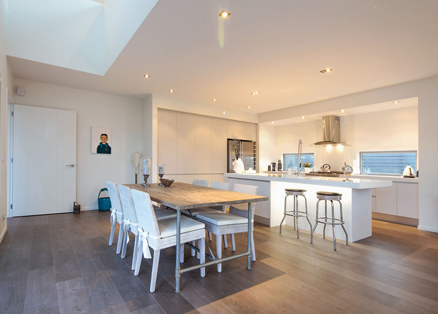 Wooden floorboards throughout the open plan spaces bring warmth and resilience inside, contrasting with the sawcut concrete outside. A void space alongside the walkway above allows light to flood the dining room and entry area below. Colours selected were white and greys for the exterior to expand/draw on the airy nautical feel and compliment the client’s plans for a light palette inside.