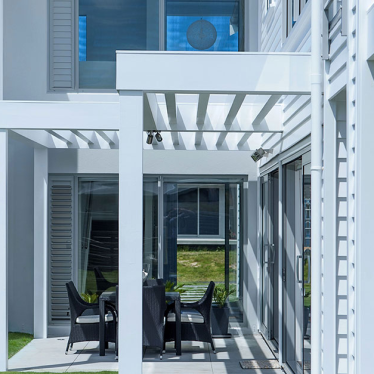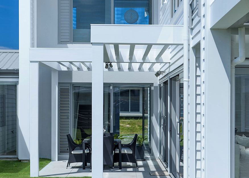 Substantial timber columns, beams and louvres were used in the outdoor spaces to provide shade from the sun. Louvre screens were installed to provide privacy from the neighbouring property.