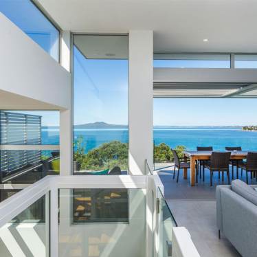 This project maximises clifftop views at each cascading level. The building remains secluded from the bay on the sea-facing, rear edge of the property as it rises above the dense native flora flanking a public walkway from Murrays Bay.