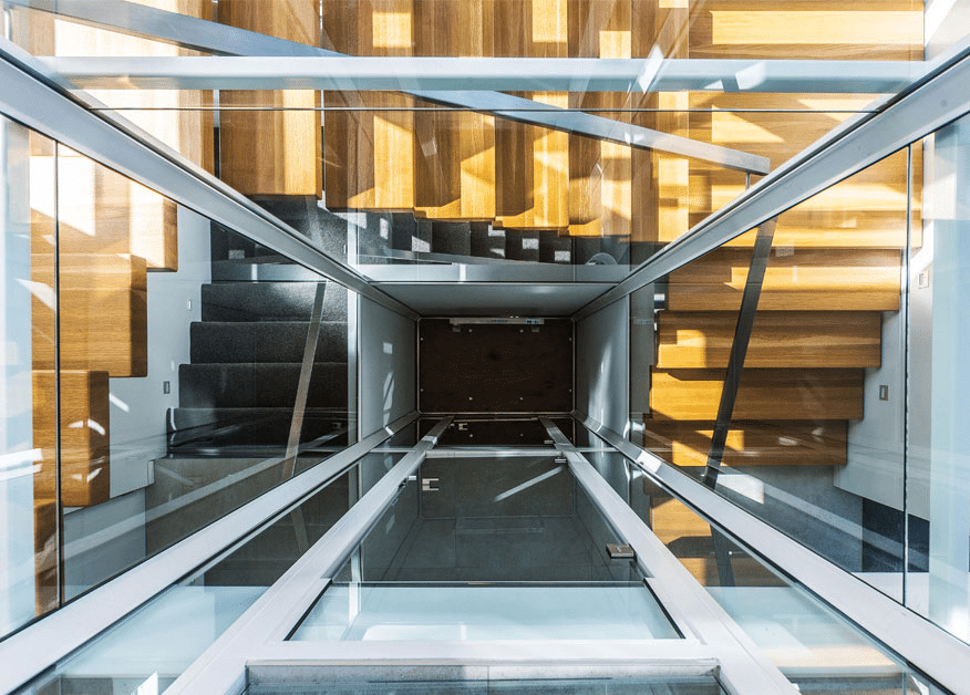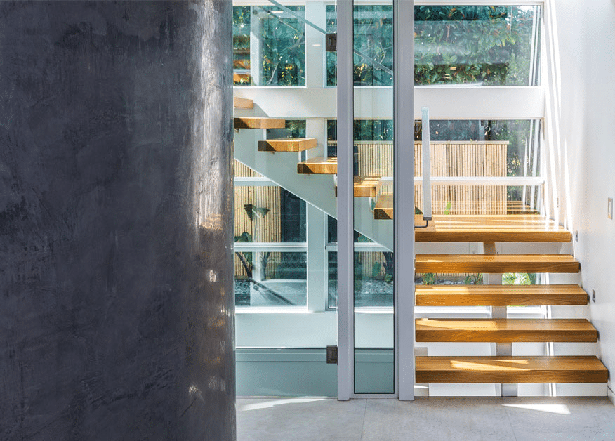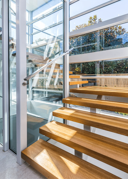 This involved low maintenance cladding materials and multiple entertaining spaces on the upper and ground floor, enabling the flexibility of dual inhabitation of upper and lower floors. Access to the upper floor includes a lift incorporated into the central light well with timber stairs wrapping around. The upper floor includes an accessible plunge pool alongside a large deck entertaining space. With separate access, the upper floor remains secure and private while the owners are away, allowing extended family to continue residing on the lower floors.