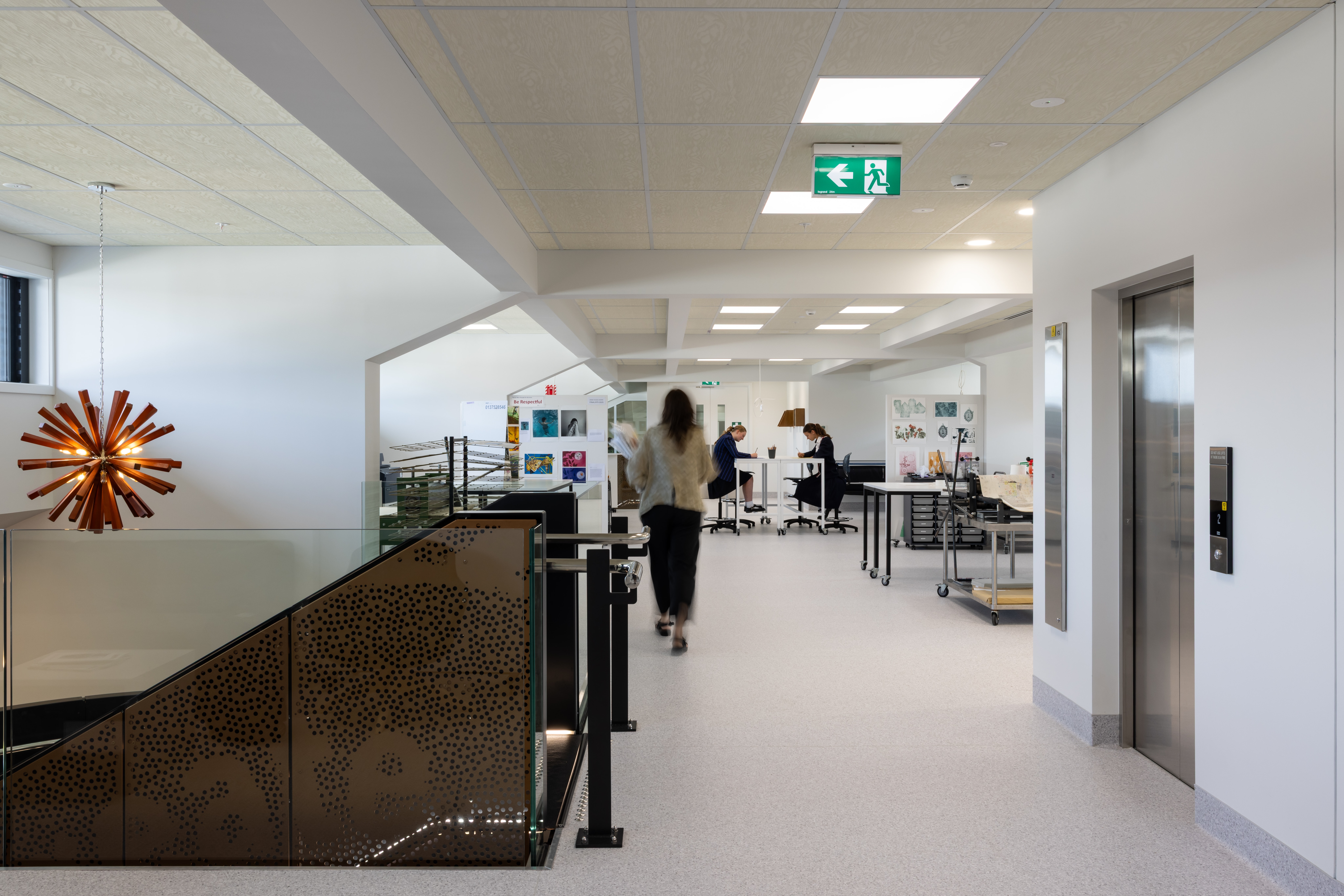 The mezzanine level serves as a hub for senior Art students, providing spaces for individual studio work alongside specialist facilities for silk screening and etching. The area features light-filled classrooms with adaptable layouts to support both group learning and independent study. Mobile furniture allows the space to be easily transformed into an exhibition area, while dedicated display cases showcase student artwork, creating an inspiring gallery environment within the building.