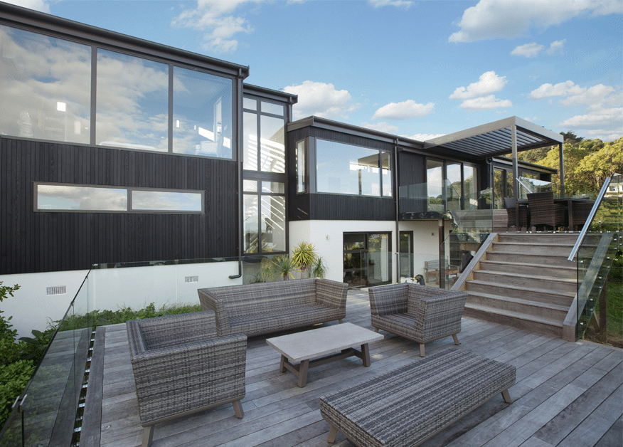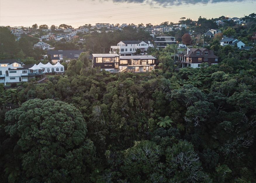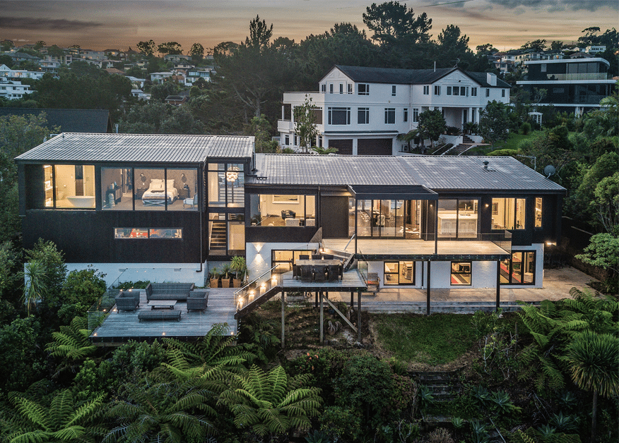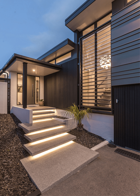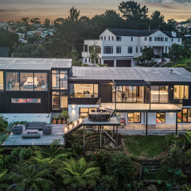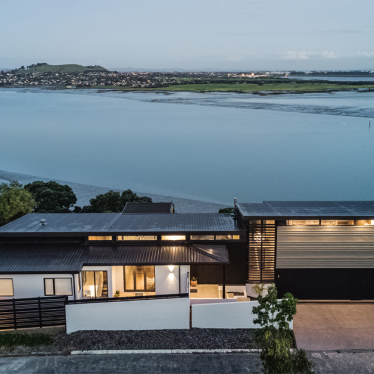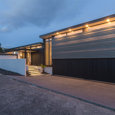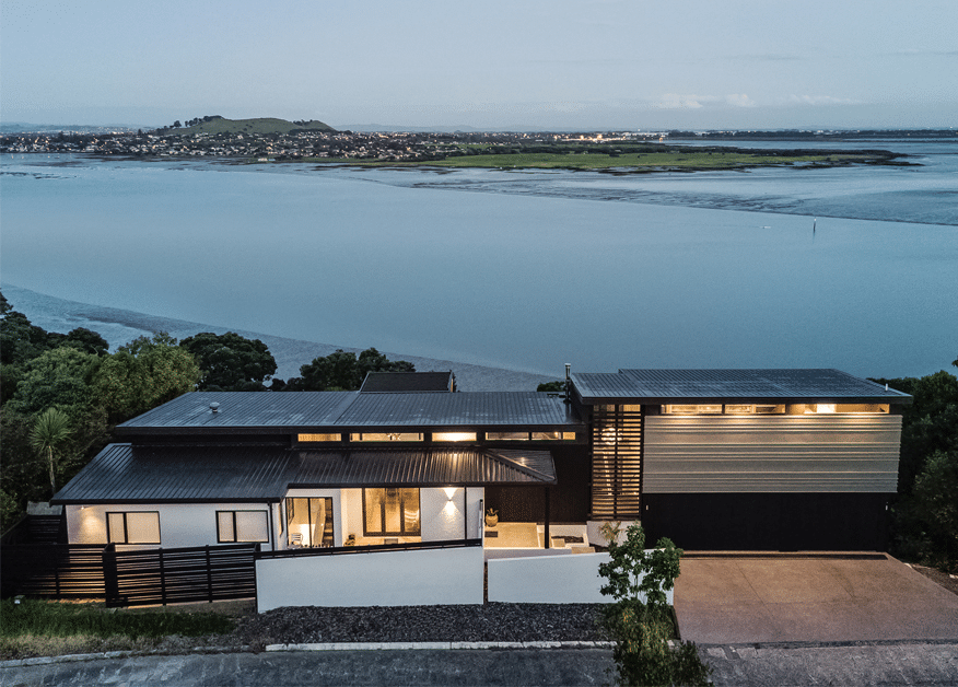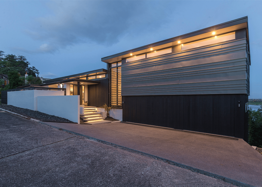 The approach to the home directs focus to horizontal ribbed zinc clad box mimicking the grey moody hues and rippling waves of the Manukau Harbour.