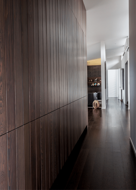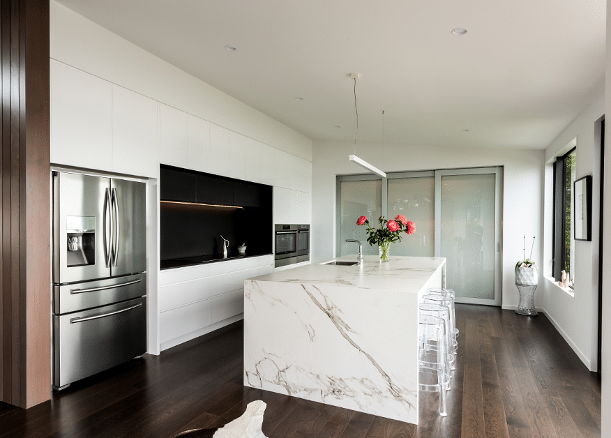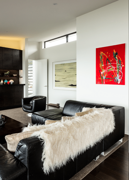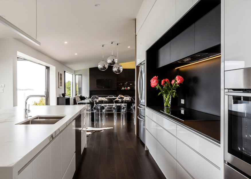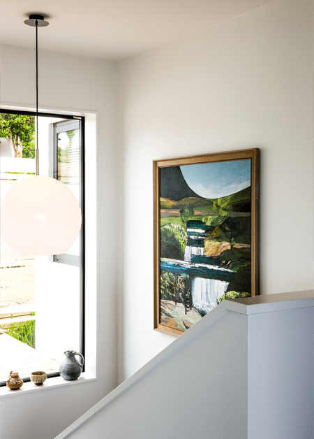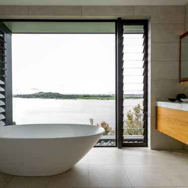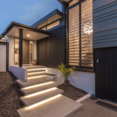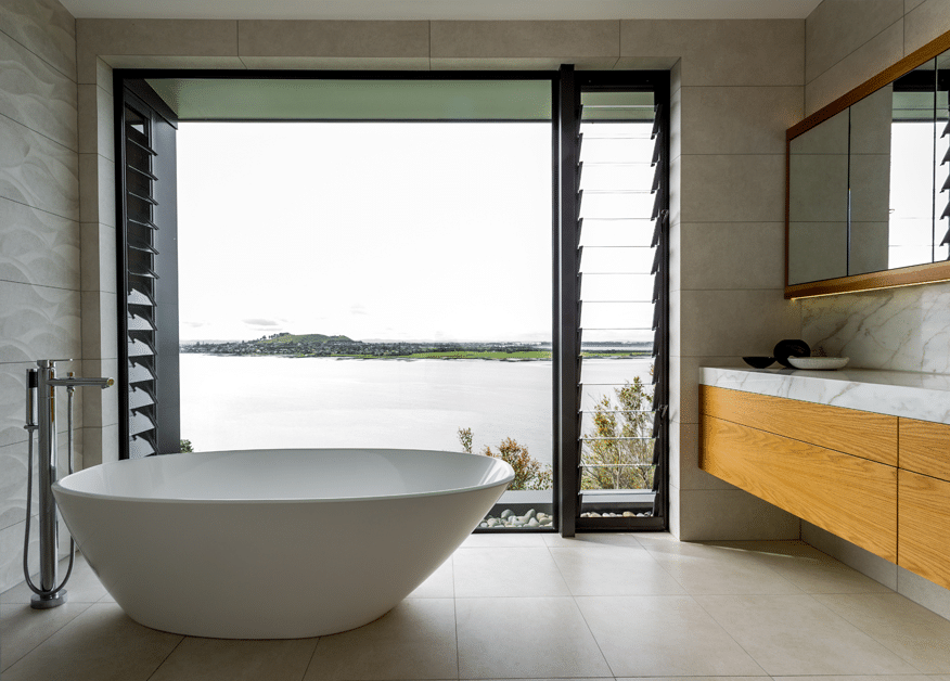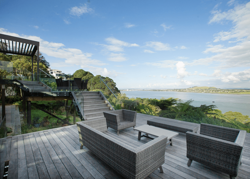 The approach to the home directs focus to horizontal ribbed zinc clad box mimicking the grey moody hues and rippling waves of the Manukau Harbour.