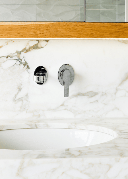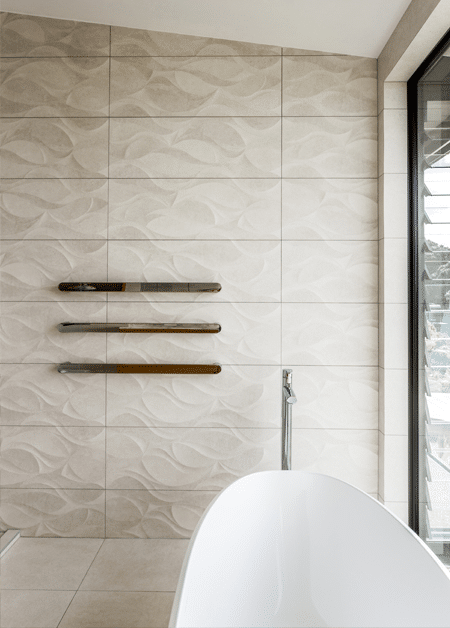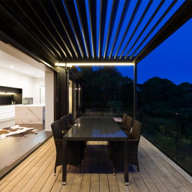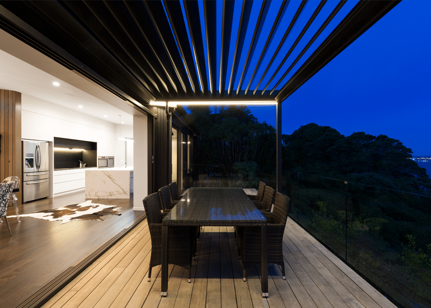 The existing outdoor decks have been transformed from the original awkward shapes, now streamlined into simple rectangular forms. Replacement of the busy timber handrails with frameless glass maximises the panoramic views and creates an illusion of an outdoor space floating above the tree canopy. These decks are linked together as a layered series of platforms stepping down the site from the living area. A louvered roof was added to the deck off the living to optimize the usability of this area and extend the living area realm.