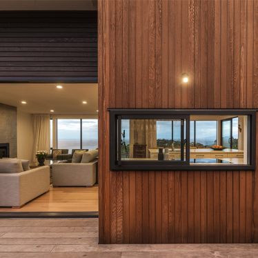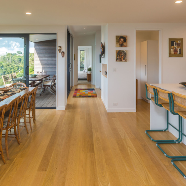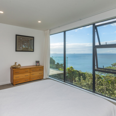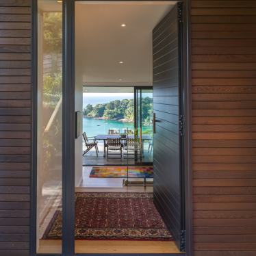 The clients expressly desired a view from the front entry through the house down to Hekerua Bay.