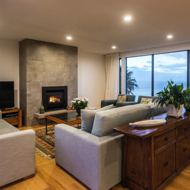 Our approach was to design a house with an emphasis on use of sustainable natural materials, and textures that blend and shift with the light and surrounding vegetation. We worked to ensure that outdoor living could be maximised, without undue exposure to the elements. Two sheltered decks were designed, one between the dining and the master bedroom on the main level and a second one directly below, forming an essential element in this couple’s lifestyle.