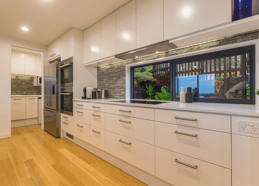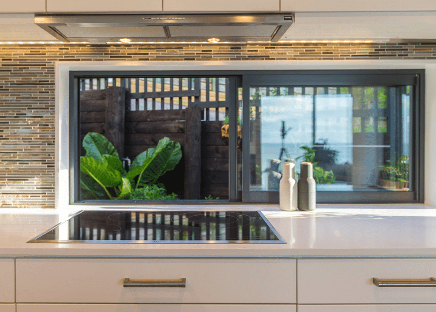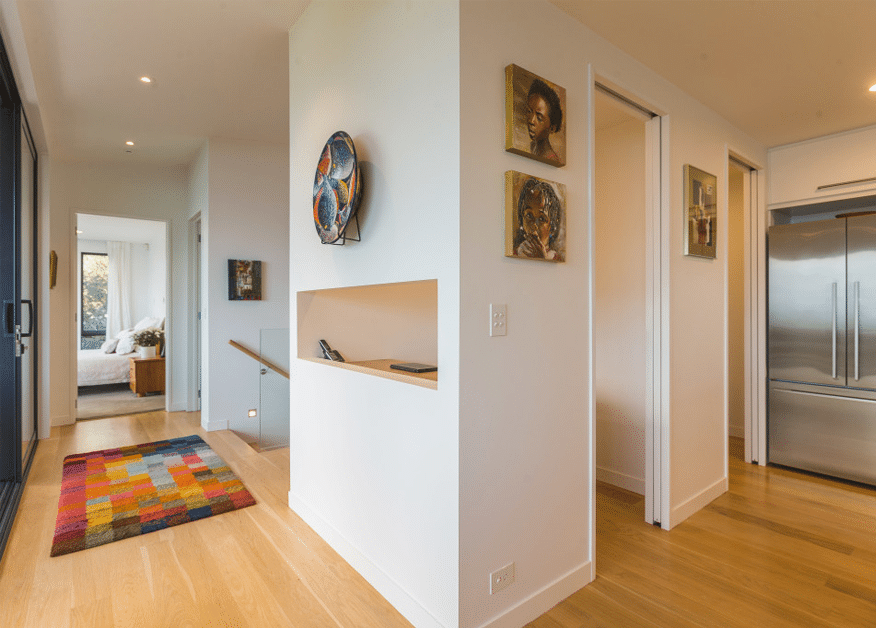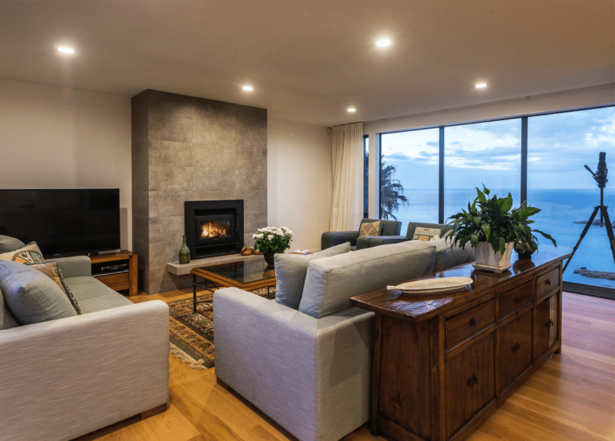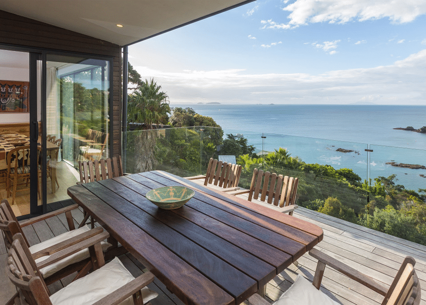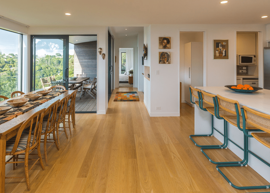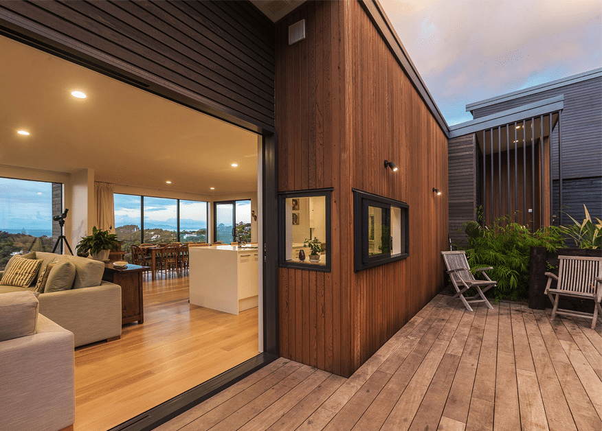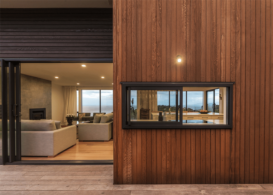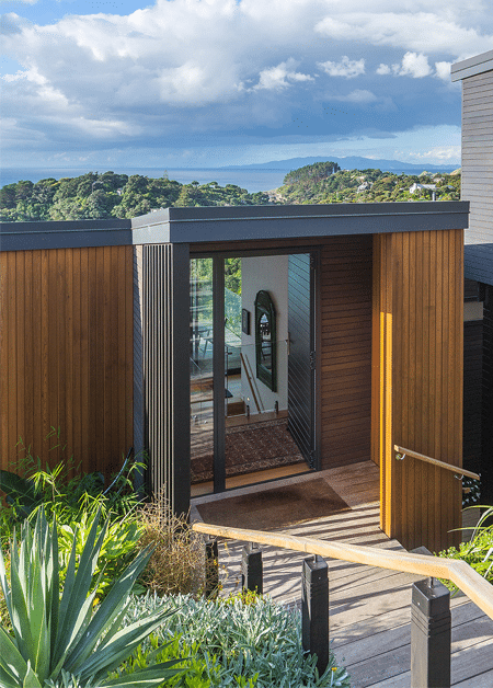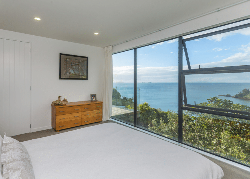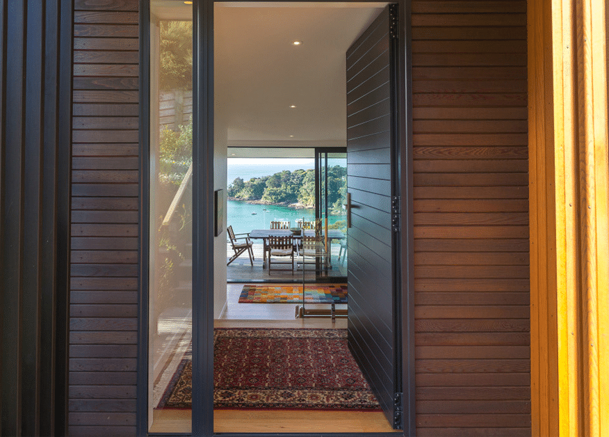 The clients expressly desired a view from the front entry through the house down to Hekerua Bay.