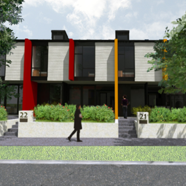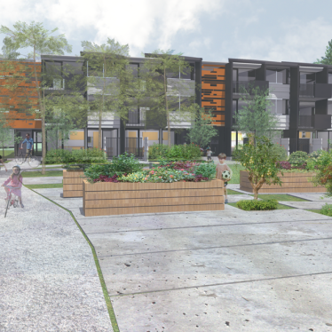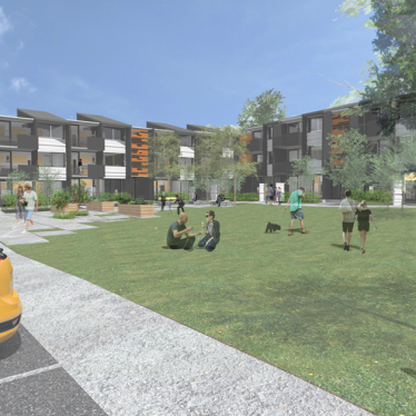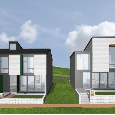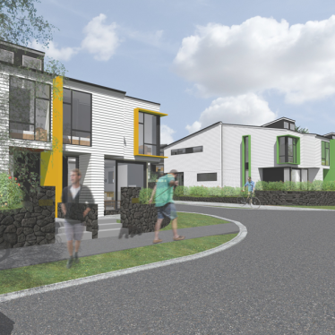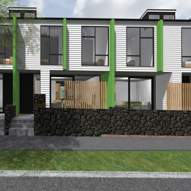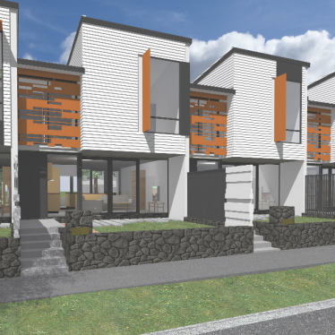 The brief is for a 66-unit development in Three Kings, Auckland featuring a diverse housing mix. Three and four bedroom terrace houses are the frontage to denser one and two bedroom apartments grouped around a central community core.