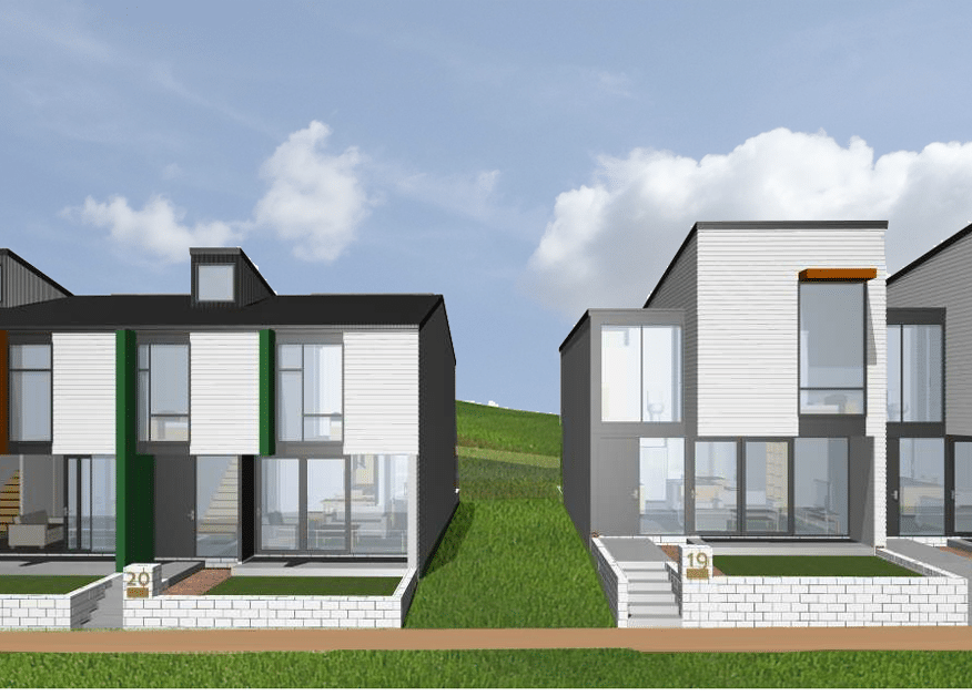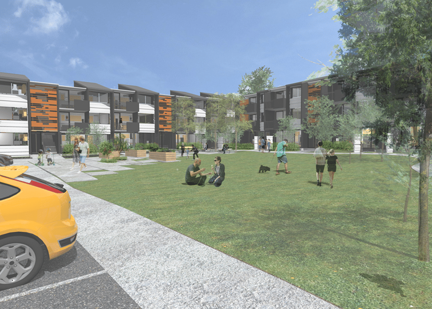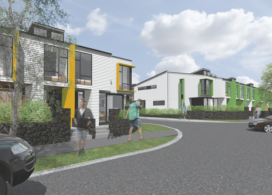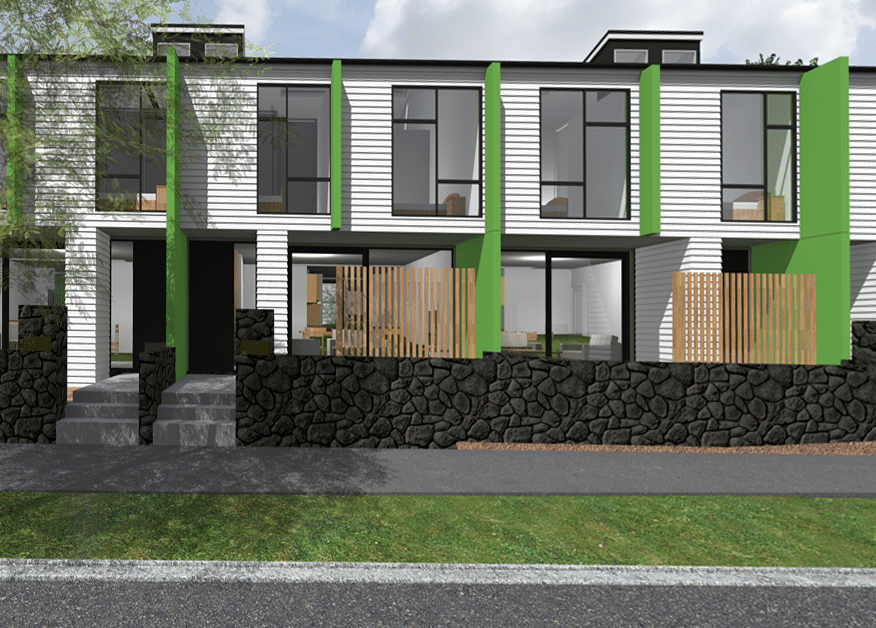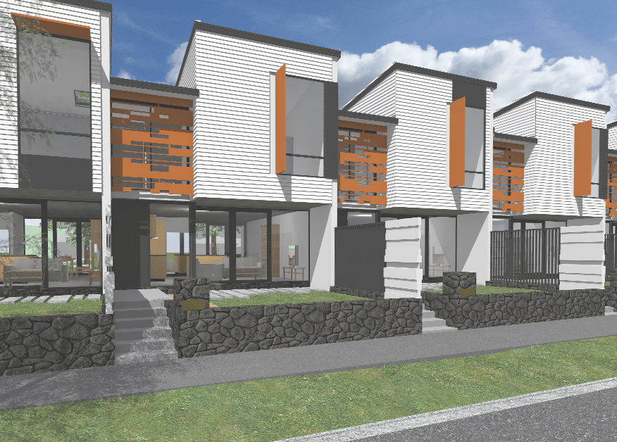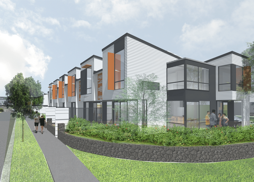 The brief is for a 66-unit development in Three Kings, Auckland featuring a diverse housing mix. Three and four bedroom terrace houses are the frontage to denser one and two bedroom apartments grouped around a central community core.