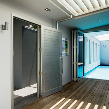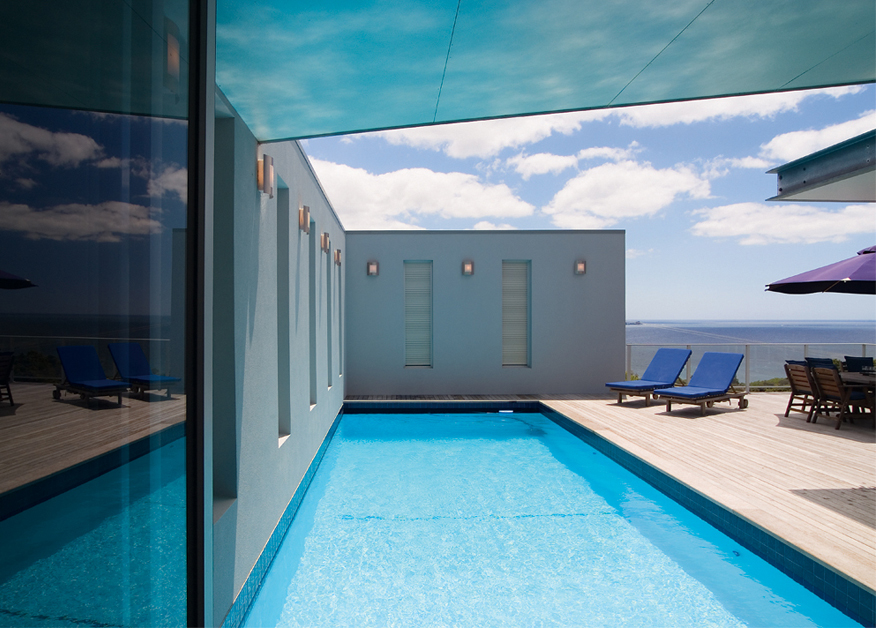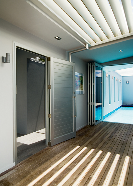 Due to the topography it was important to have the majority of the outdoor living area accessible from the main living floor. This evolved into an indoor/outdoor room sandwiched between the main living area, entrance and swimming pool. The electronic louvers, allow natural light into the space with the ability to take in the views through the glazed living pavilion with the advantage of being sheltered from the elements.