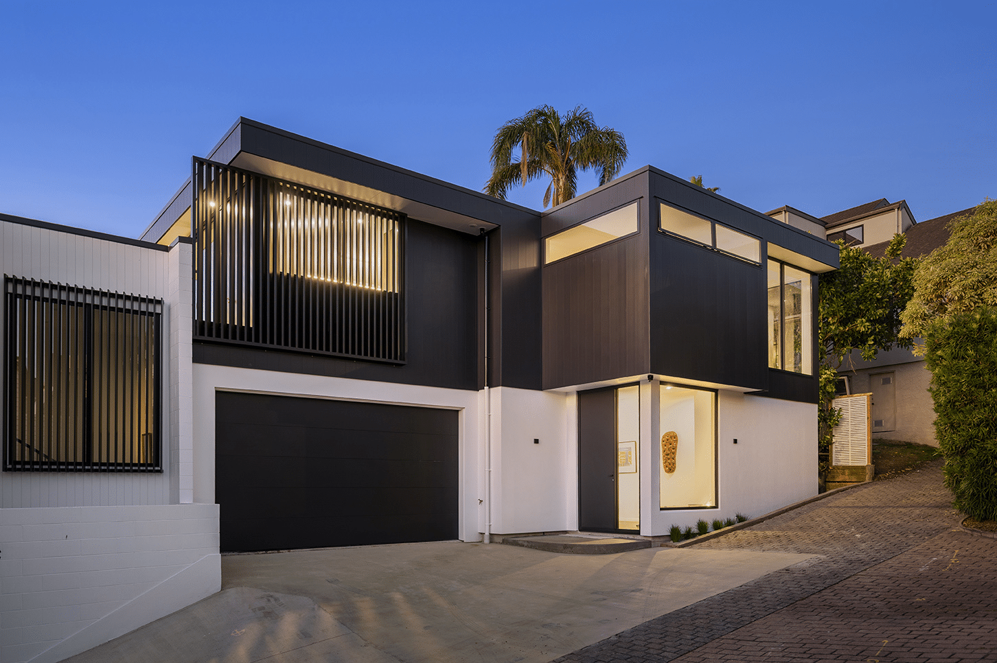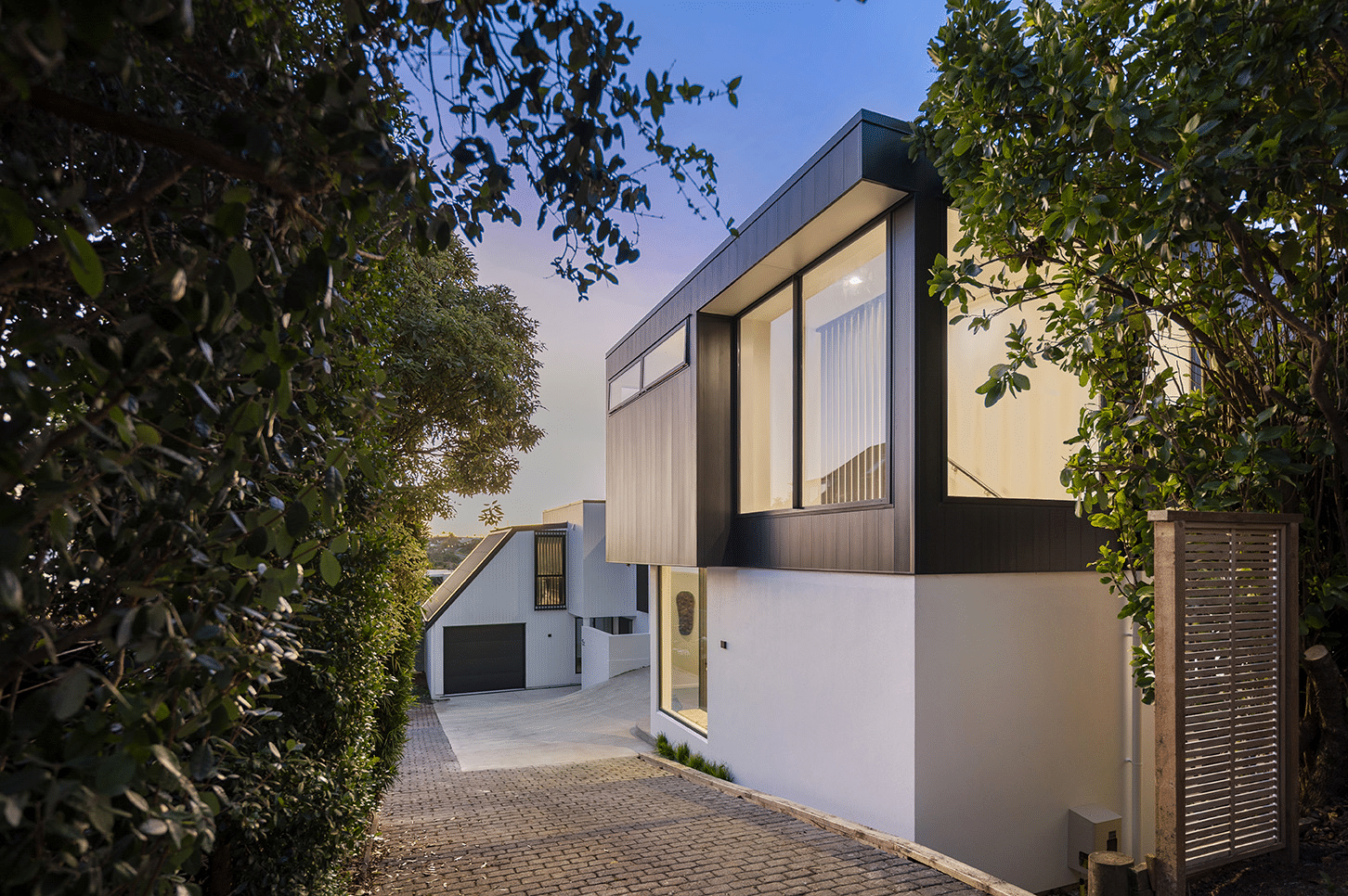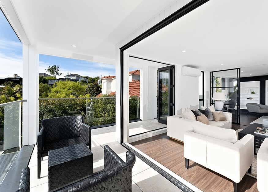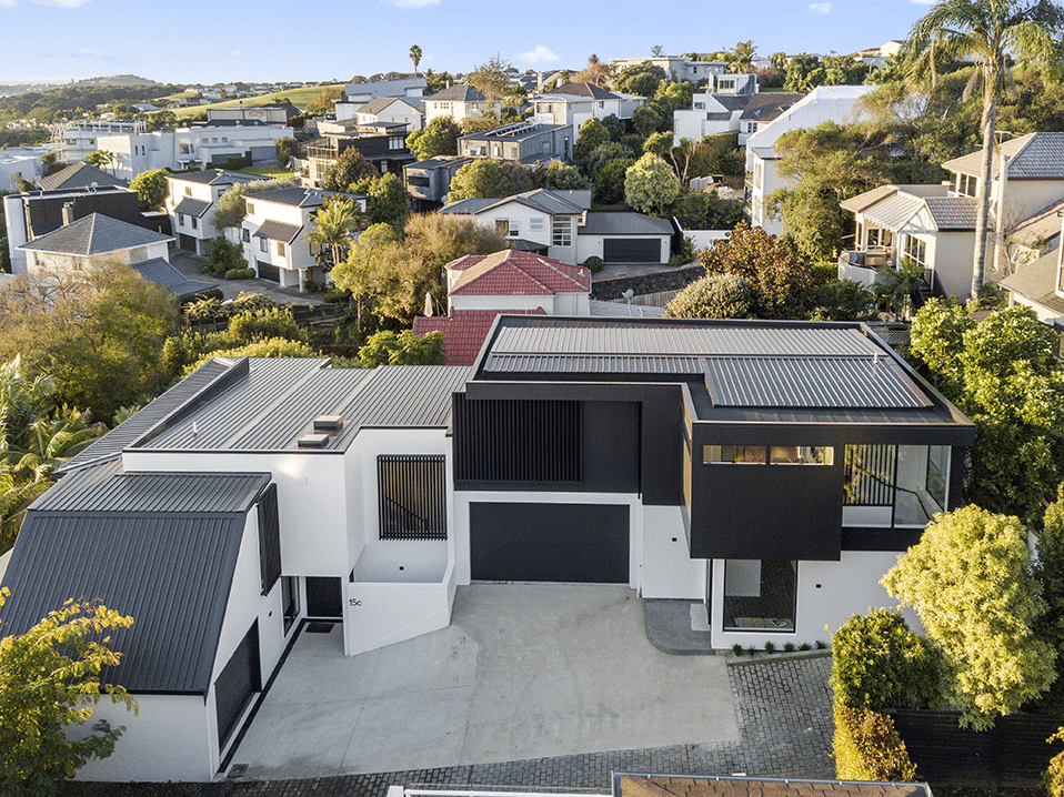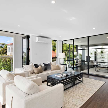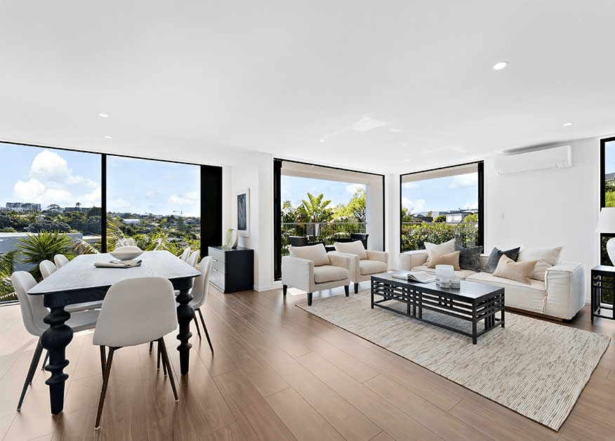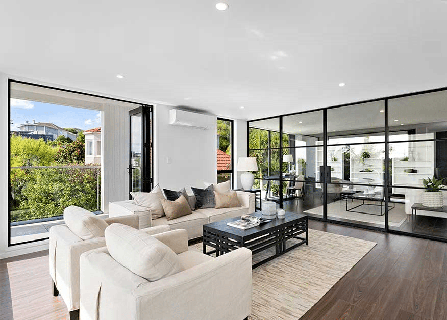 The homes were demolished to the slab and rebuilt with an efficient, sustainable envelope and long-lasting materials. Now, the site houses two contemporary, modern homes that maximise their position in one of Auckland’s most prestigious neighbourhoods, drawing in natural light at every opportunity and embracing the incredible views to the sea.