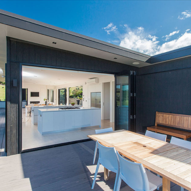 A retained courtyard to the rear of the house creates an ideal entertaining area, capturing the afternoon sun.The house is clad in a mixture of dark stained grooved ply and dark vertical profiled metal cladding.