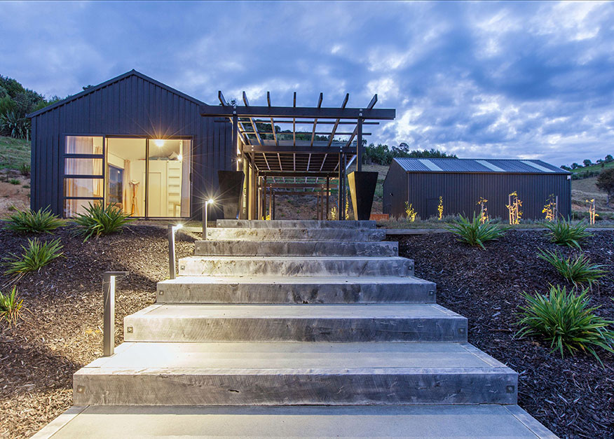 From the road the developments are sleek and unobtrusive, cut close into the slope to achieve a minimal disturbance on the horizon, and coloured a dark charcoal to recede further into the landscape. The vertical profile of the cladding adds texture back into the architecture and is an attractive foil to the long horizontal aspect.