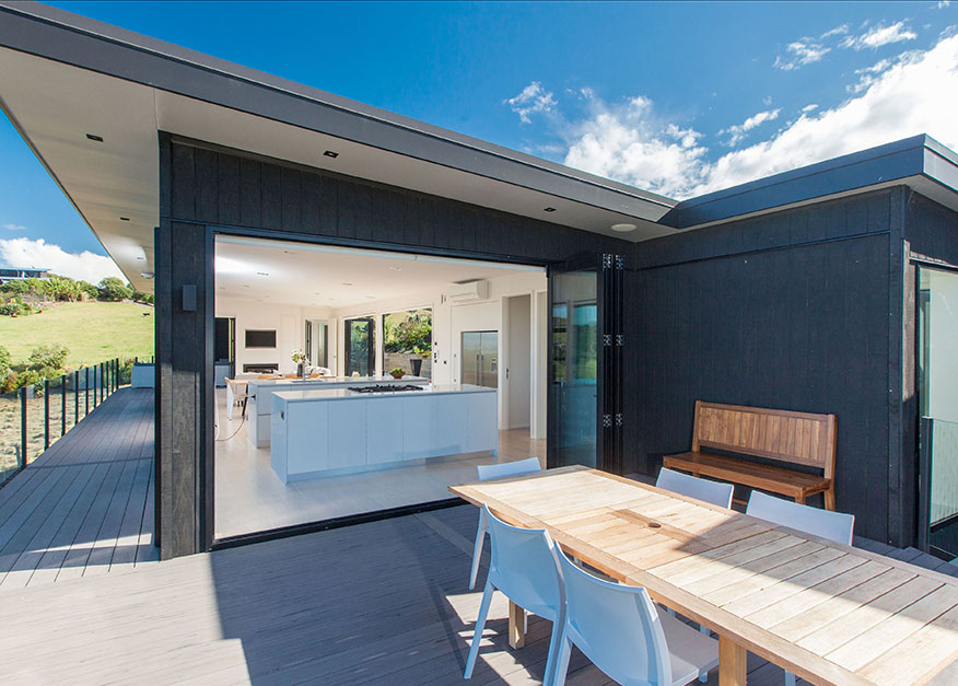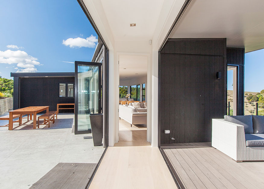 A retained courtyard to the rear of the house creates an ideal entertaining area, capturing the afternoon sun.The house is clad in a mixture of dark stained grooved ply and dark vertical profiled metal cladding.