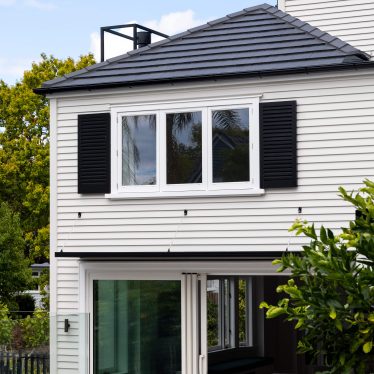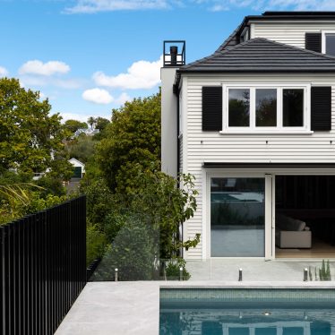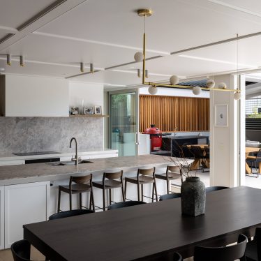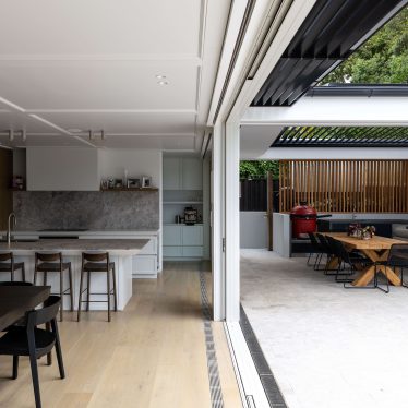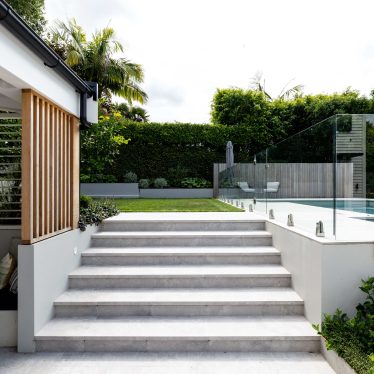 The finished result dramatically fulfils this brief. The staggered building line has been squared off into a single, straight line and extended, creating more space on the main floor and the levels above. The main living spaces now flow seamlessly to a new outdoor room, with pool and garden beyond.