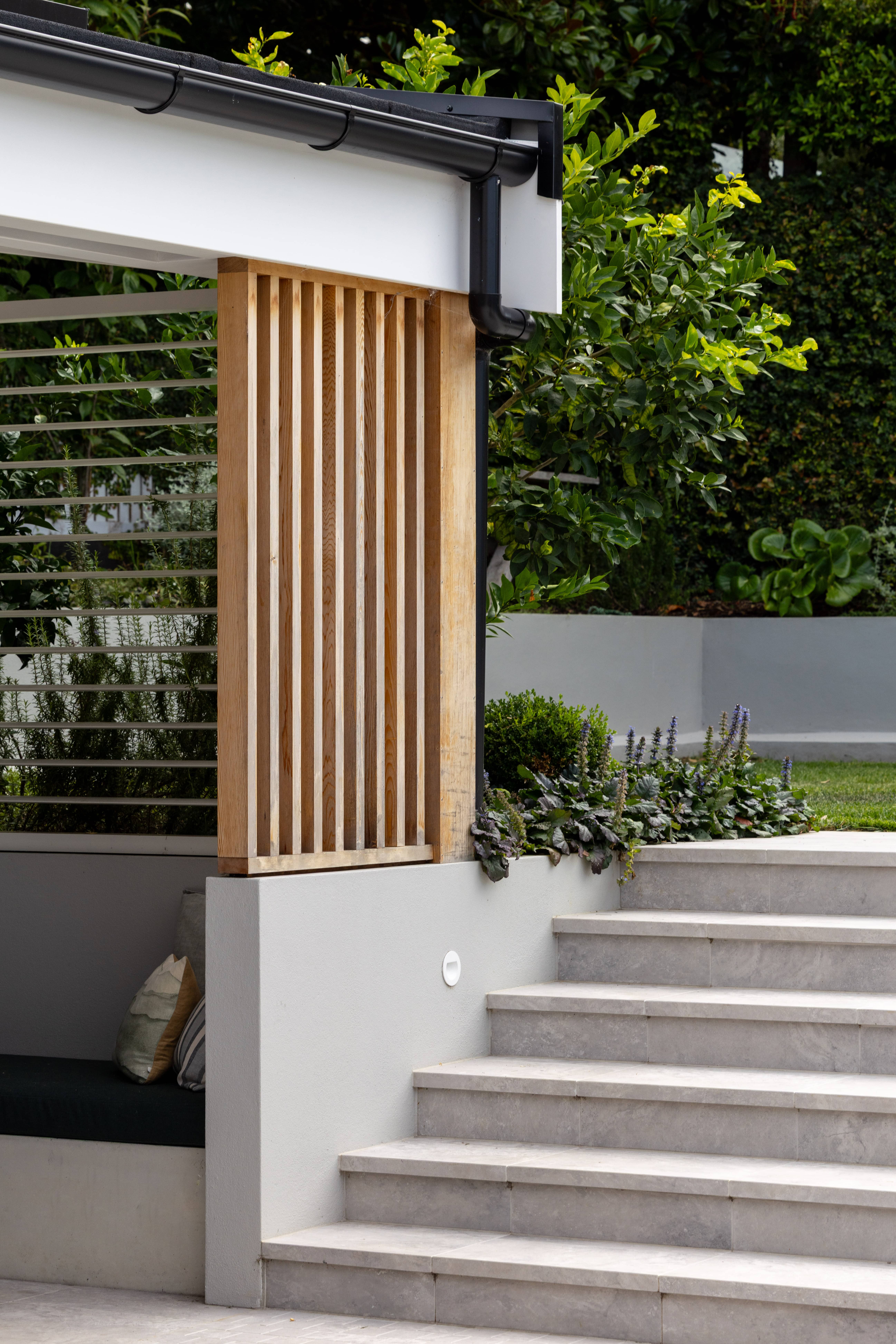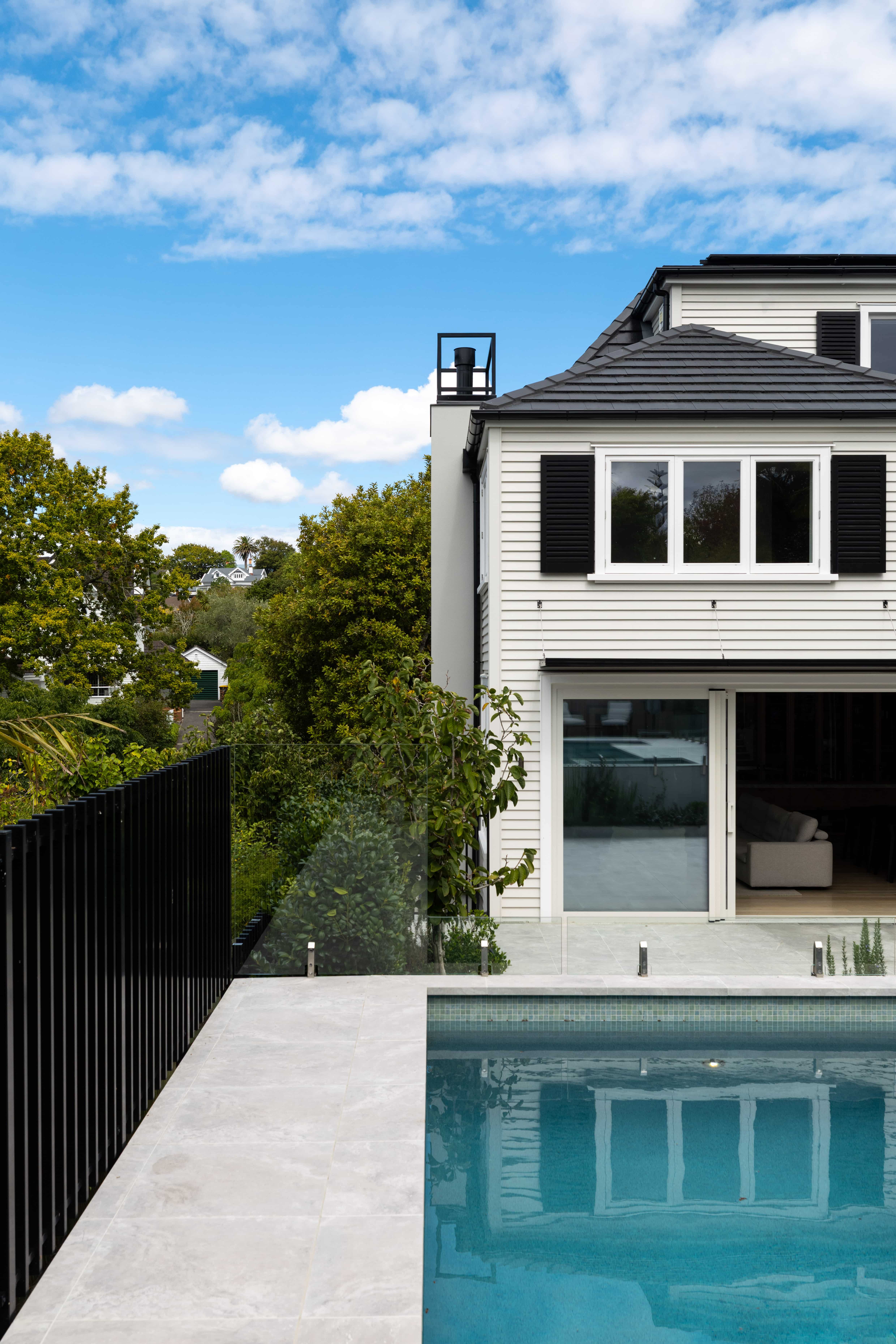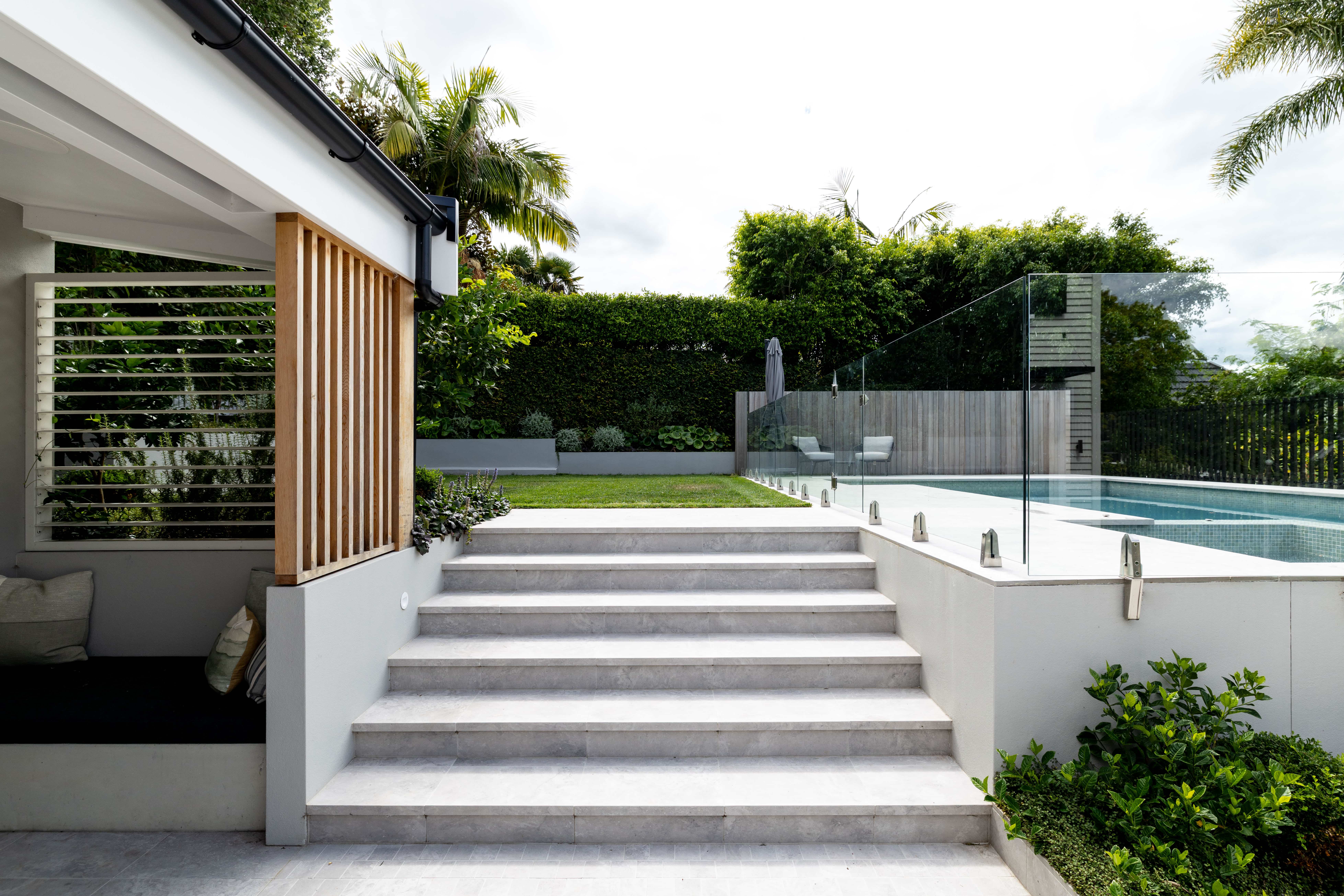 The finished result dramatically fulfils this brief. The staggered building line has been squared off into a single, straight line and extended, creating more space on the main floor and the levels above. The main living spaces now flow seamlessly to a new outdoor room, with pool and garden beyond.