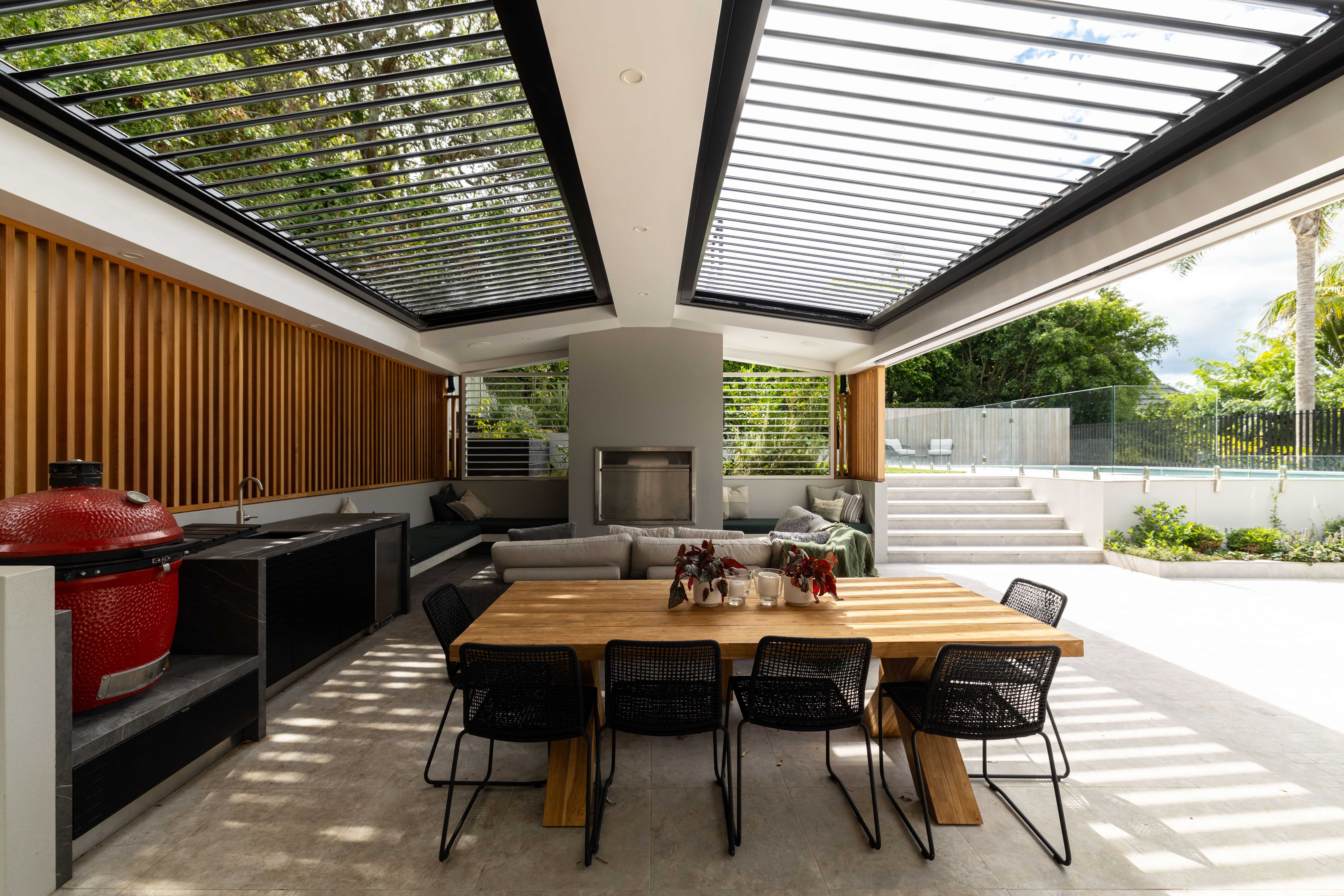 The finishes are luxurious and timeless, yet practical for the young family. The new outdoor room further extends the living space, offering a secondary area for entertaining, quiet relaxation by the fire, or gathering around the BBQ.