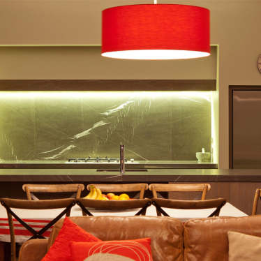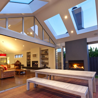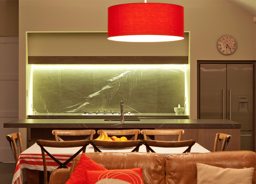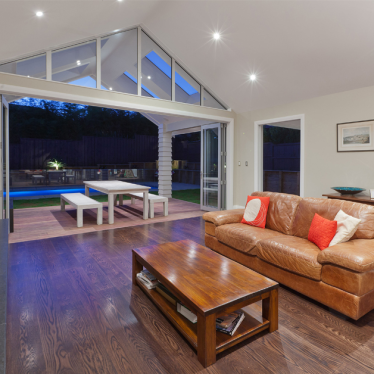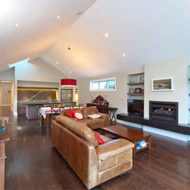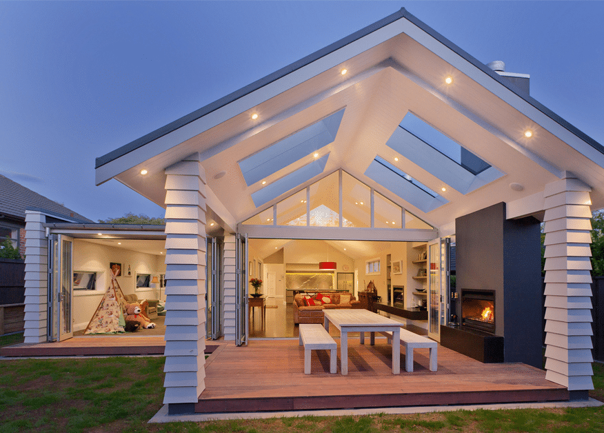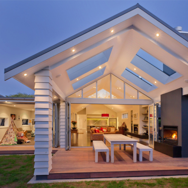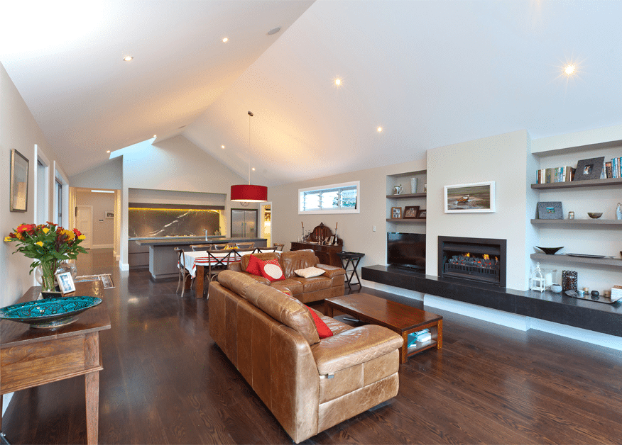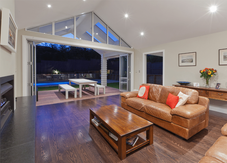 The internal space has been designed to provide open plan living, dining with a family room that can be opened or closed off to the main living area.  A raked gable ceiling in the main living space extends out to the Loggia, providing an architectural element to the central area of the home, and thus becoming a distinct design feature. Adding to this, the seamless flow through the use of bi-fold doors allows the rooms to be fully opened up, linking the northwest back yard to the home.
