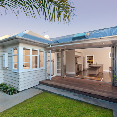 The bungalow shields the discretely hidden contemporary rear extension from the street; integrating modern elements with traditional weatherboards, character timber facings and sills.