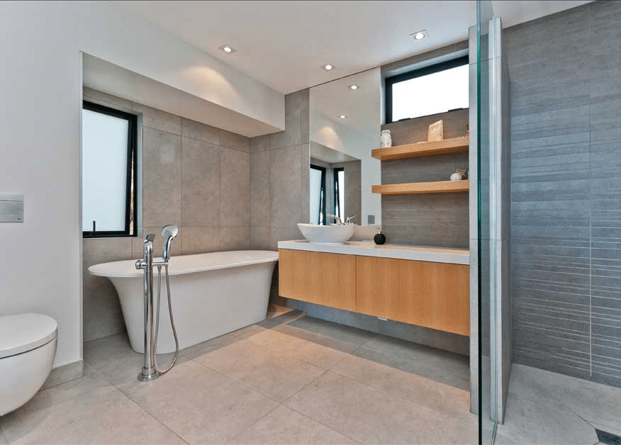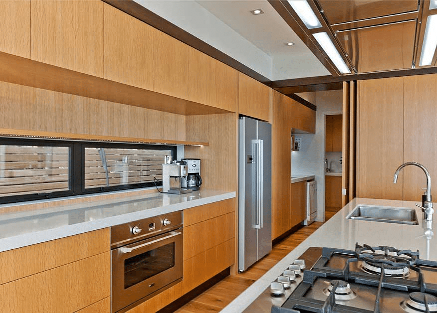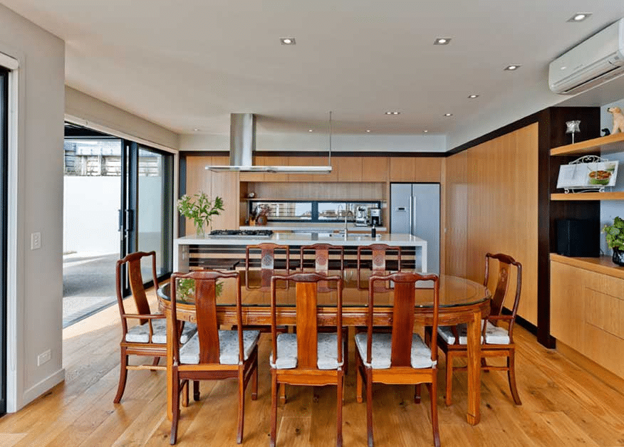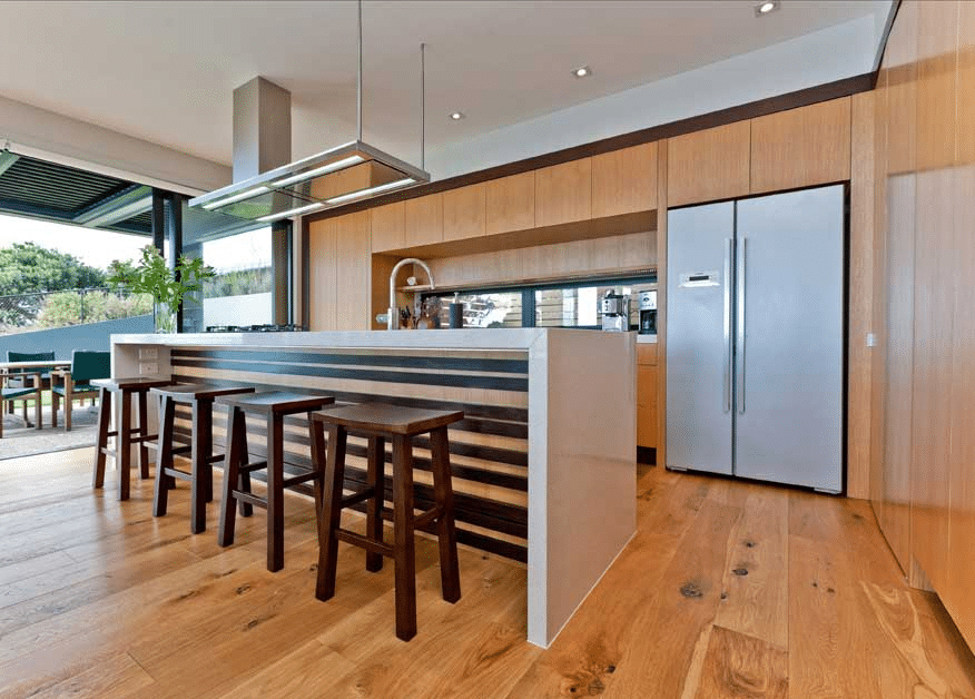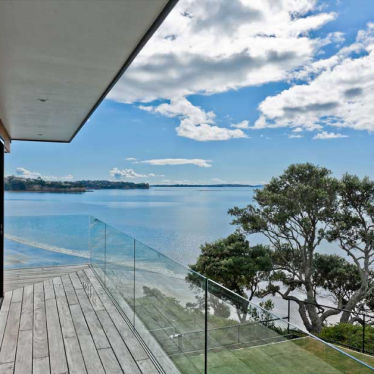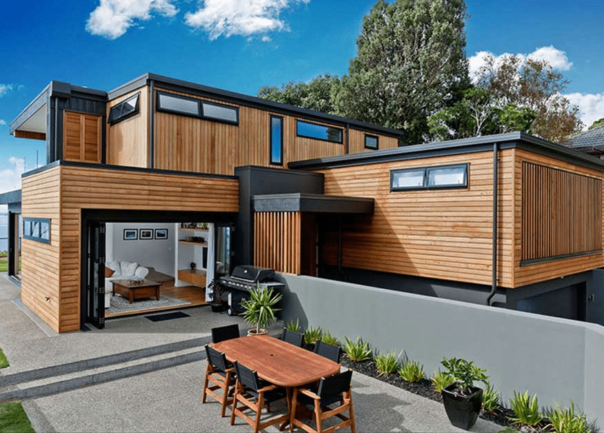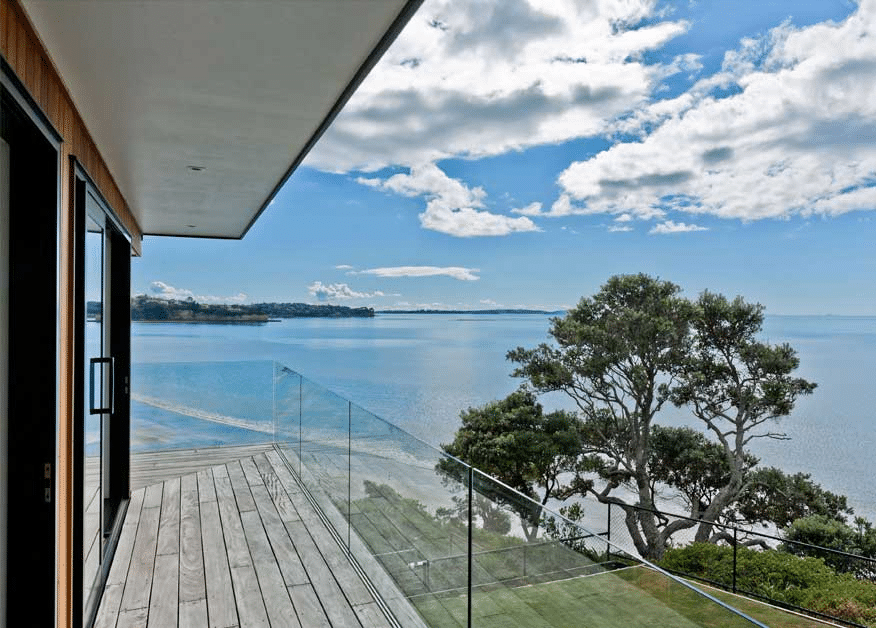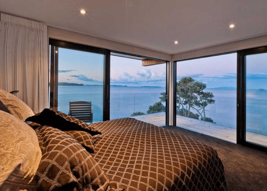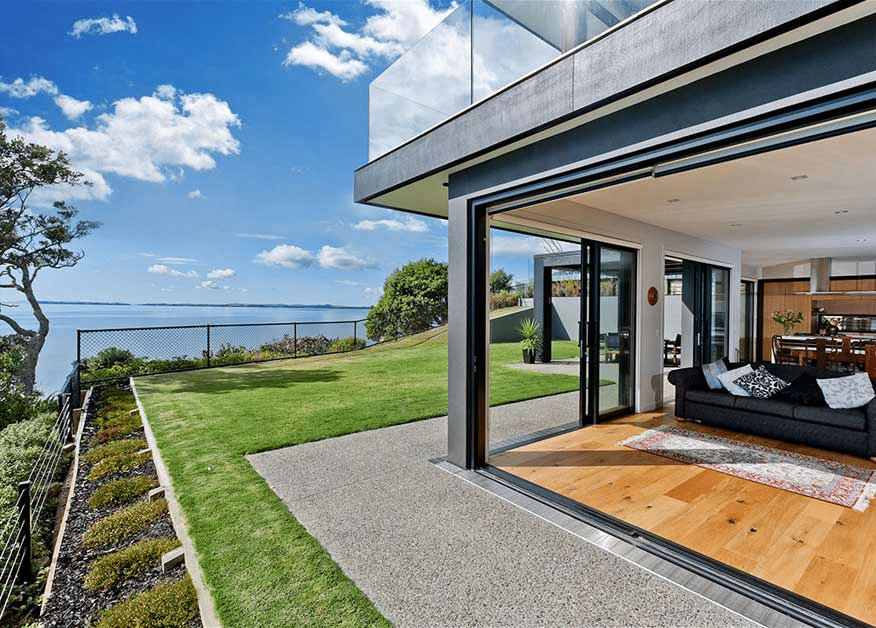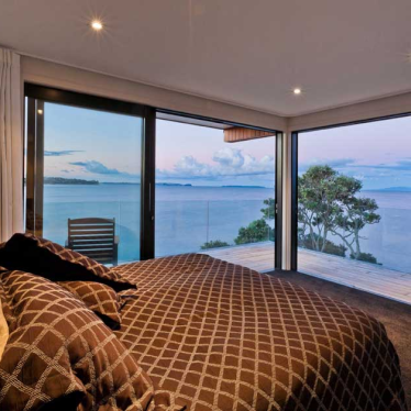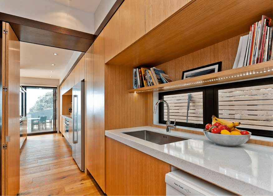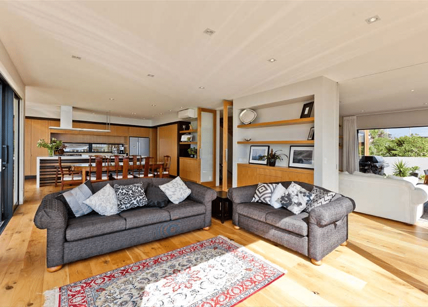 Environmental considerations impacted the design of the house, with passive and cross ventilation informing design decisions. Across the upper split level, four bedrooms are accessed with full height ranch sliders which open up to full height cedar battens which provide light, ventilation and privacy for residents of the front two bedrooms. The two rear bedrooms enjoy wraparound decks with deck sliders that open to the uninhibited views of Rothesay Bay.