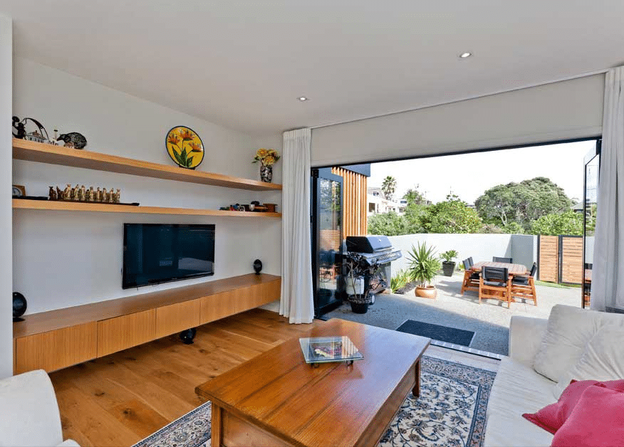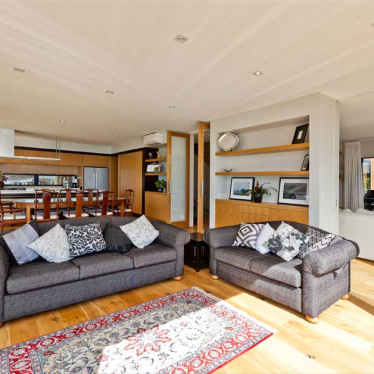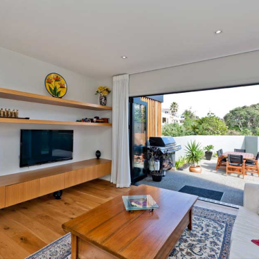 The lower floor adaptive re-uses the existing concrete floor slab, with living and kitchen repositioned to utilise passive heating. The western courtyard has been retained with a new louvre system providing windbreak on the exposed site and shade in the summer months to the kitchen. Double-glazed full height aluminium joinery in the main living area provides strong indoor-outdoor flow with flexibility and adaptability. Working with the existing parameters and following a layered approach, has resulted in a modern home which rests comfortably on a clifftop site between neighbouring high and low properties.
