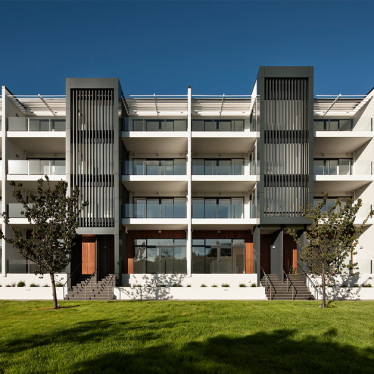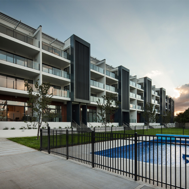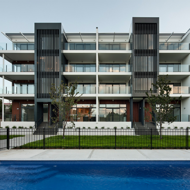 The north side of the development features communal areas with barbeques under a vast timber pergola structure with swimming pools for the residents. Lower level apartments can access the grassed area directly from their balconies.
