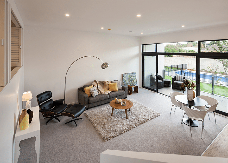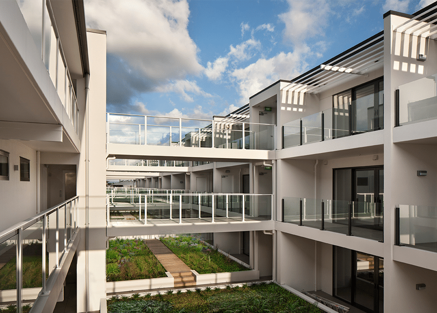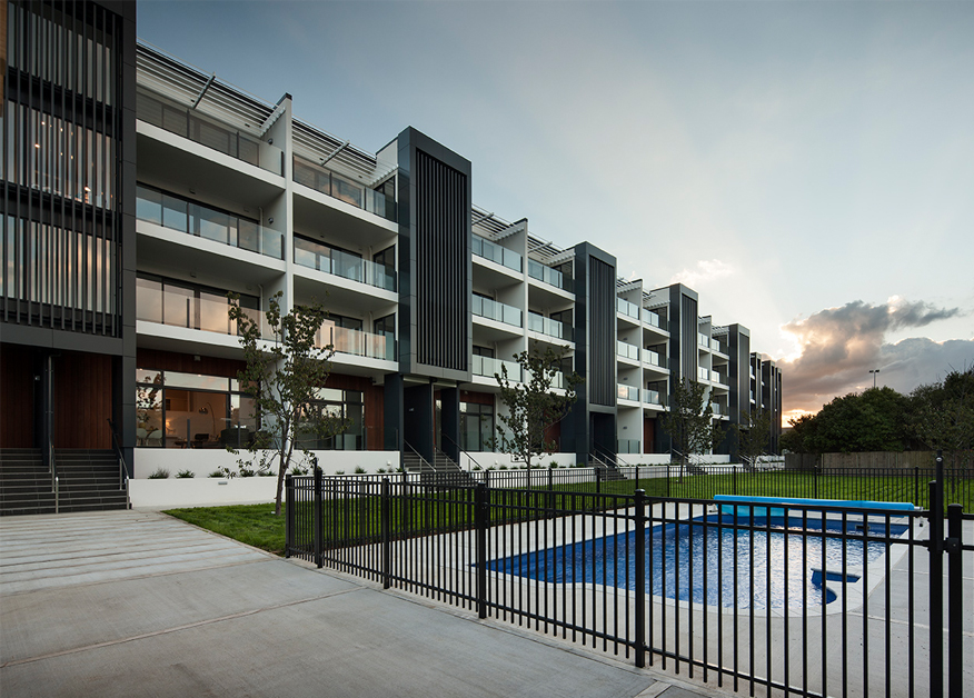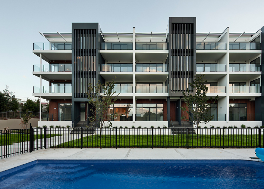 The north side of the development features communal areas with barbeques under a vast timber pergola structure with swimming pools for the residents. Lower level apartments can access the grassed area directly from their balconies.