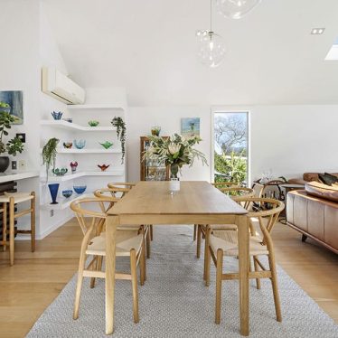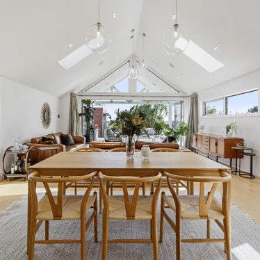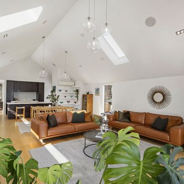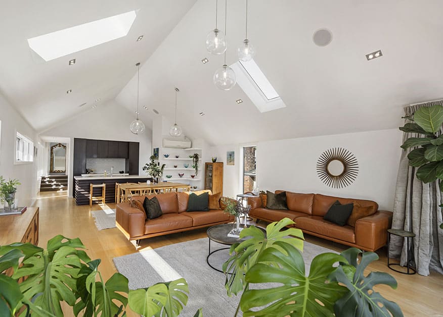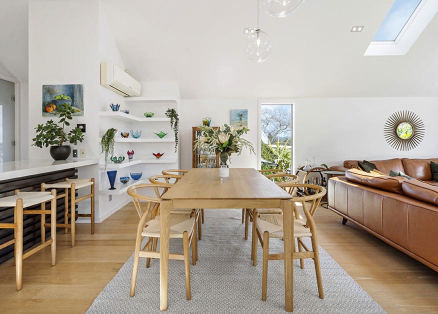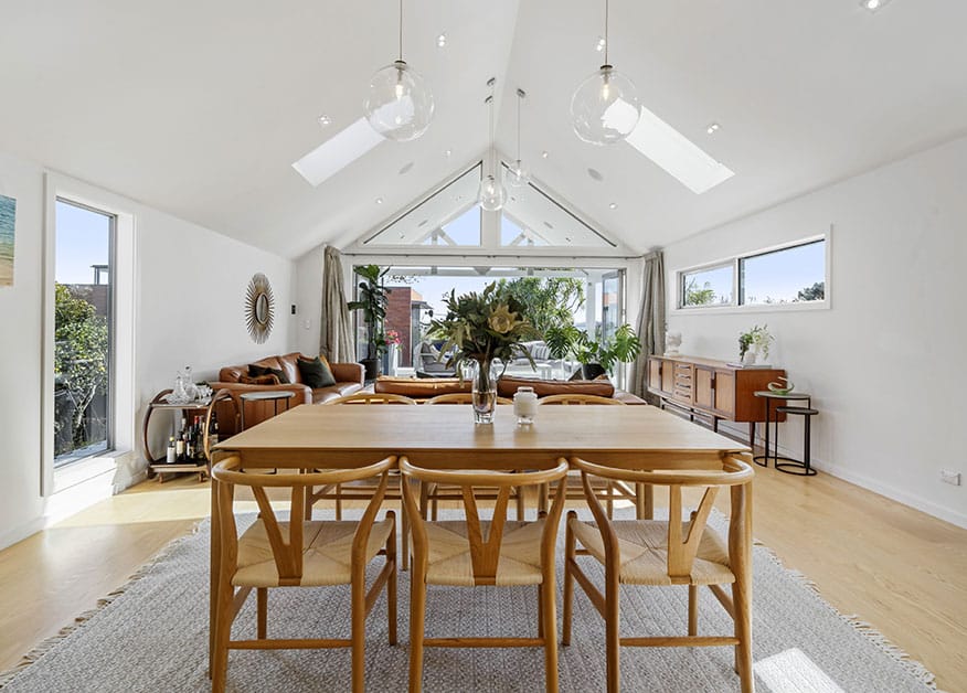 The privacy issue with the neighbours has been dealt with through high slot windows, skylights and glazing to the gable end allowing the main living area to receive natural light. This combined with raking ceilings and flush soffits creates a sense of volume and a light filled space.